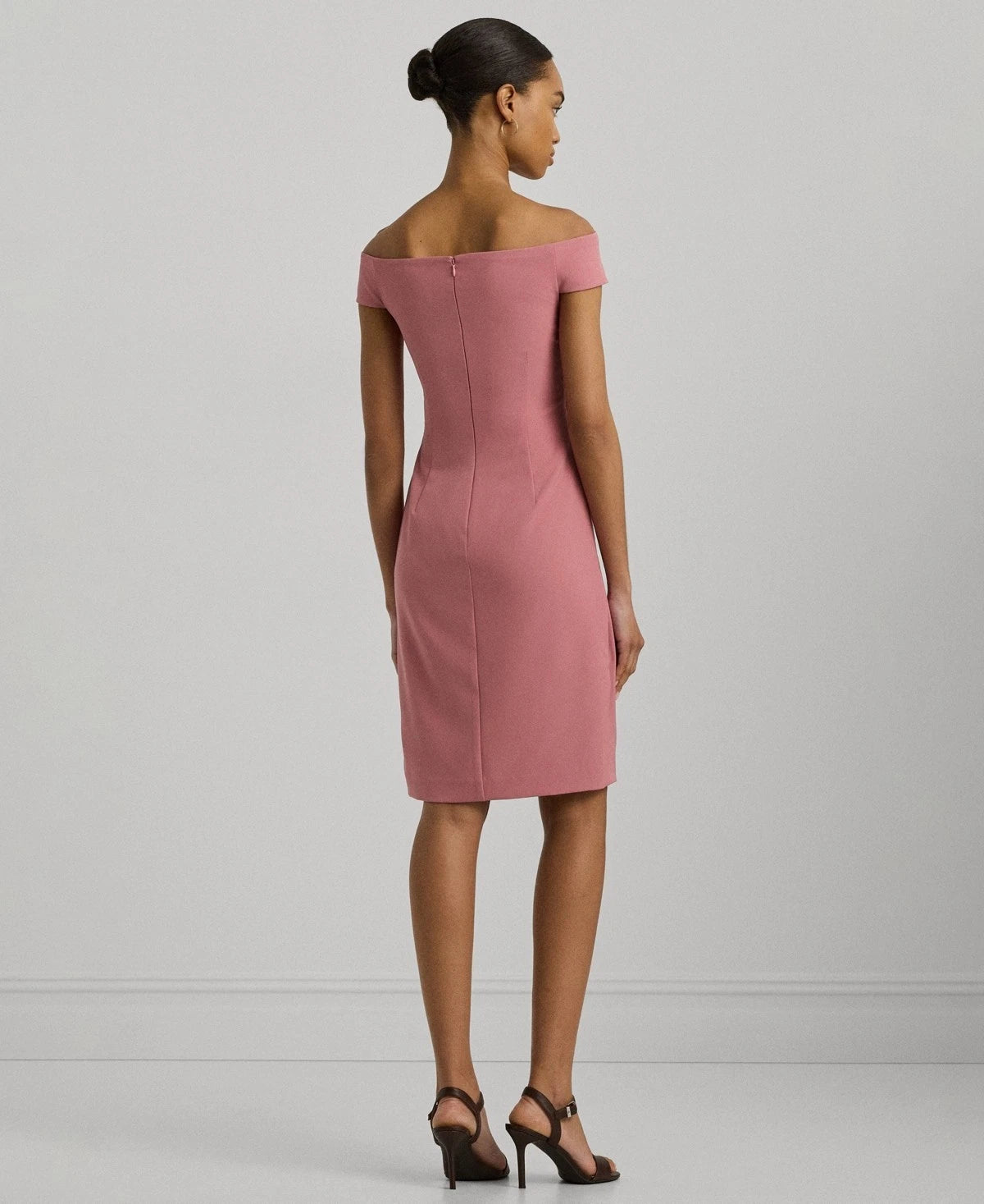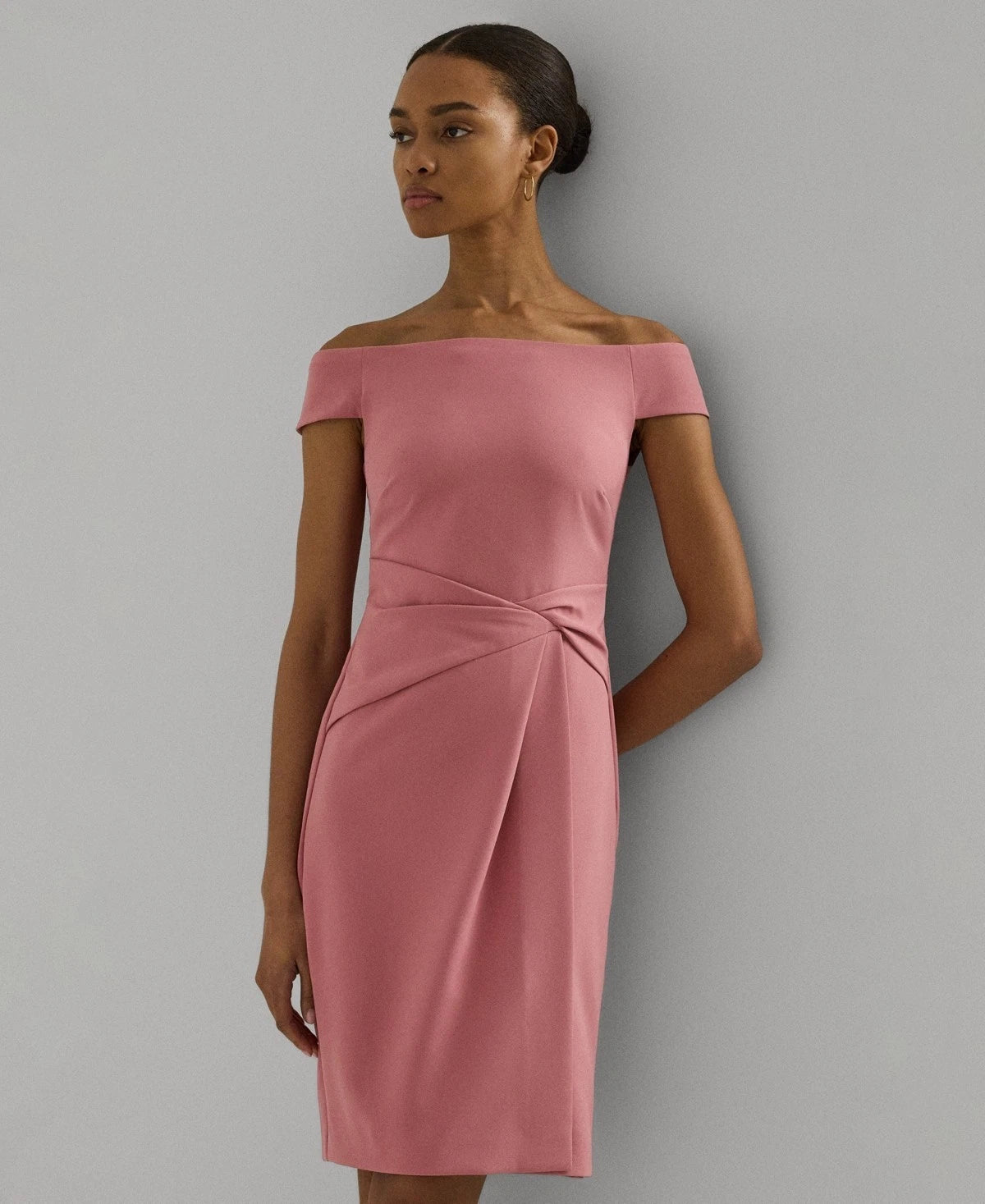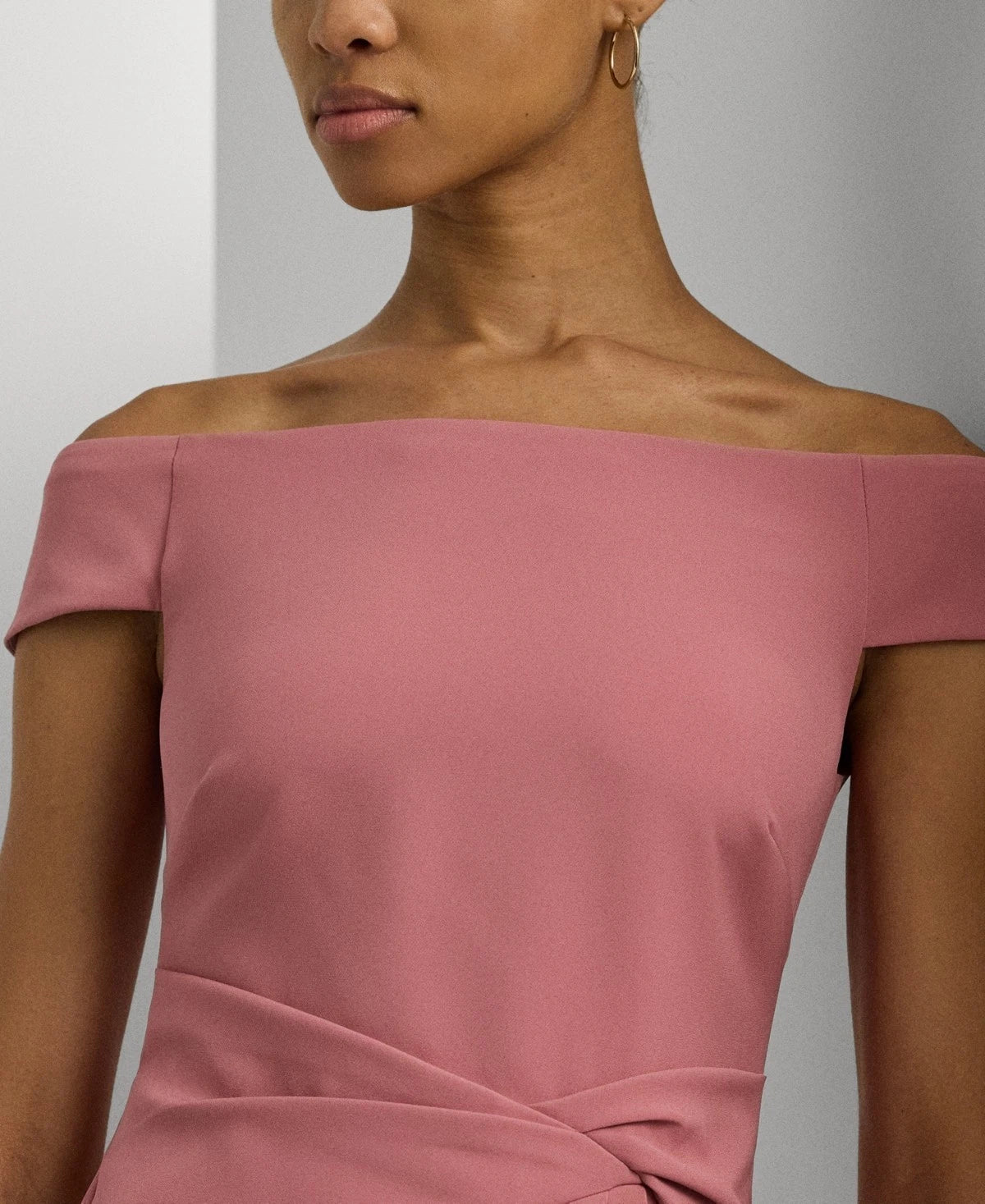 Crafted with smooth crepe for a fluid drape and a luxurious sensibility, this cocktail dress from Lauren Ralph Lauren is designed with an elegant off-the-shoulder silhouette and a chic twist detail at the waist. A slit at the skirt creates ease of movement.