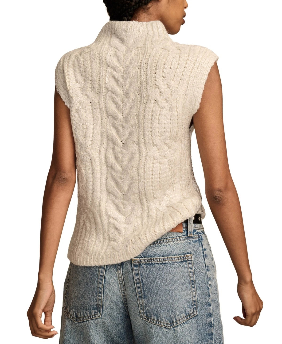 Lucky Brand Women Metallic Cable-Knit Sweater Vest Ivory Silver MSRP $90