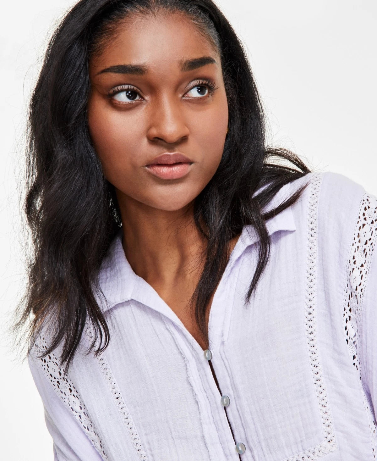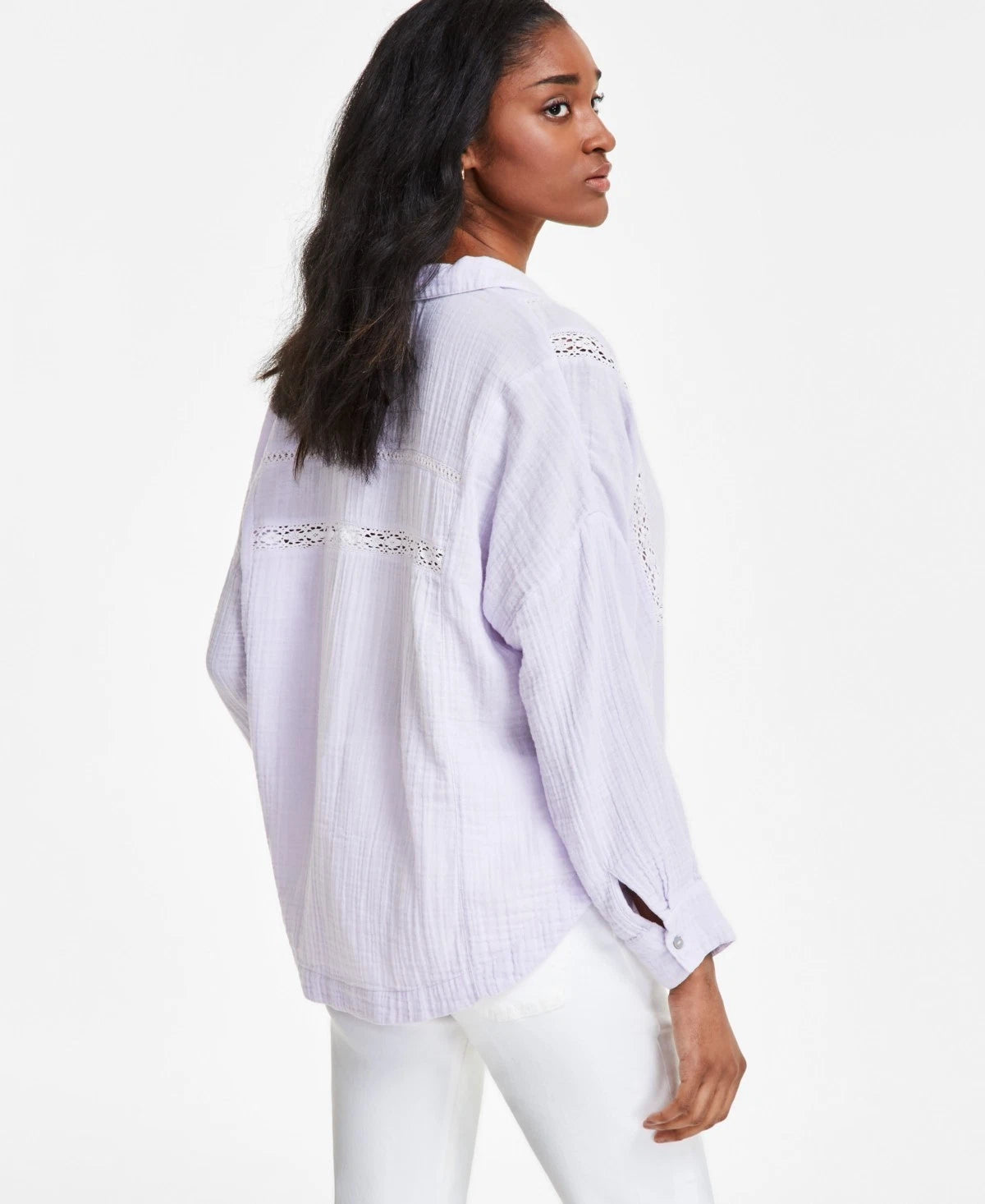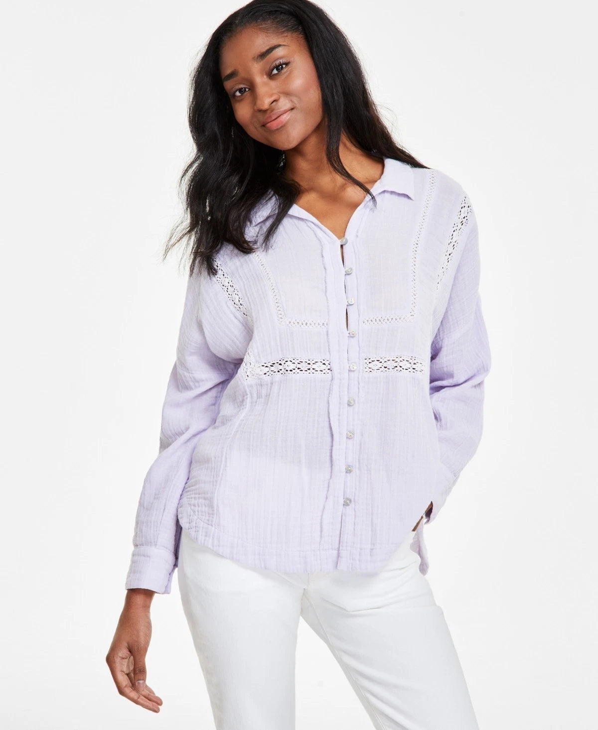 Refresh your everyday style with the Lace-Trim Gauze Shirt from Lucky Brand. Made of woven cotton gauze, this long-sleeve shirt is designed with a classic spread collar and full buttoned front, trimmed with so pretty lace detail for a feminine touch. Dress it up or down with your favorite Lucky Brand jeans, wide leg pants and more.