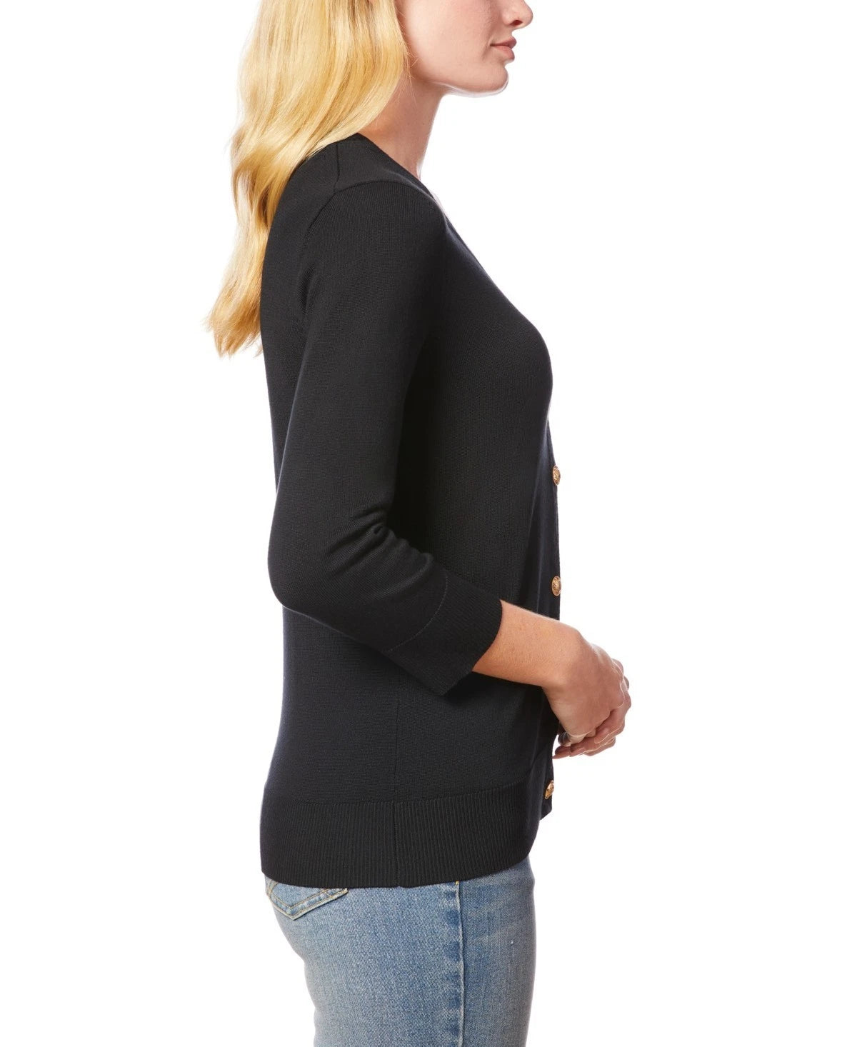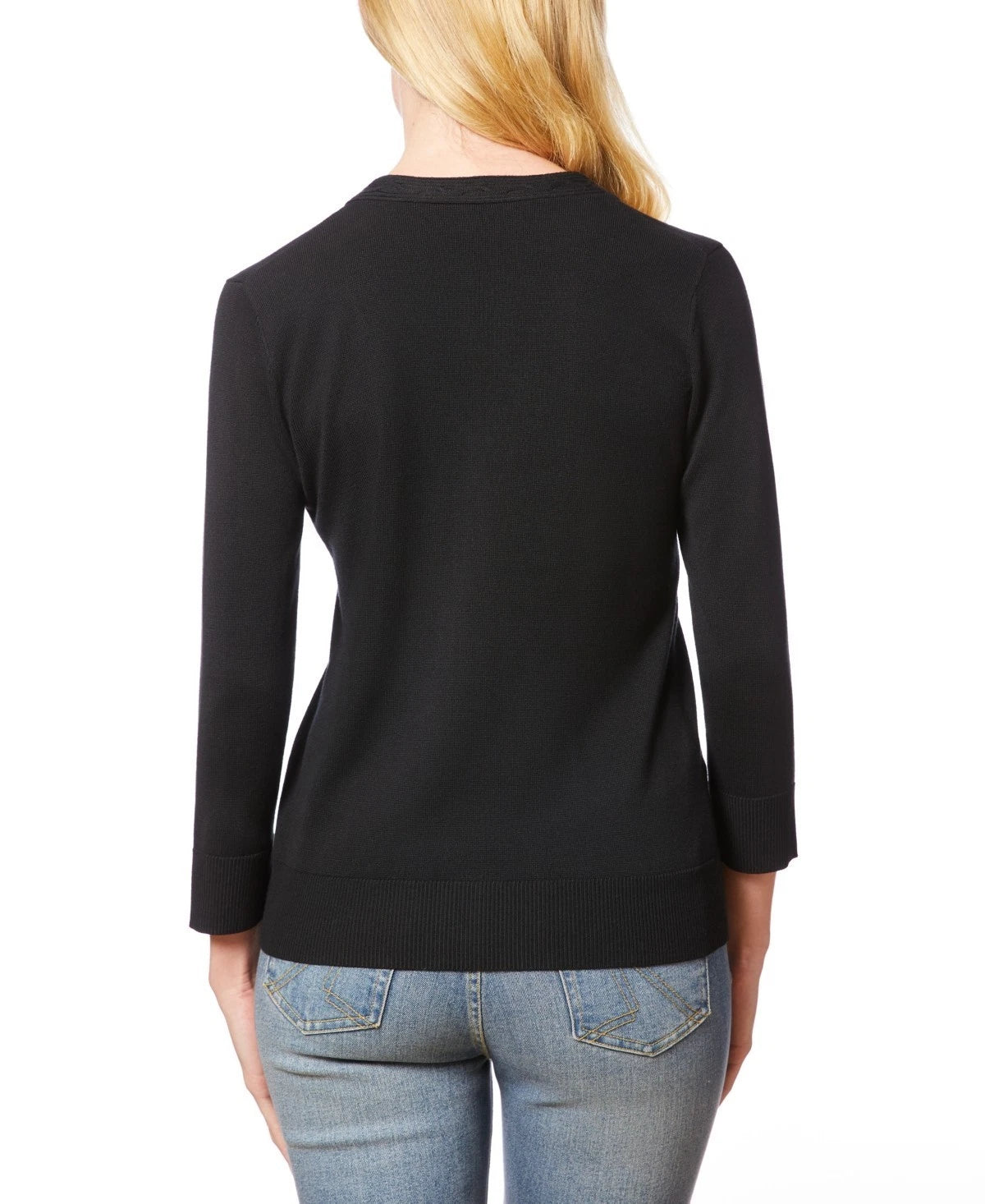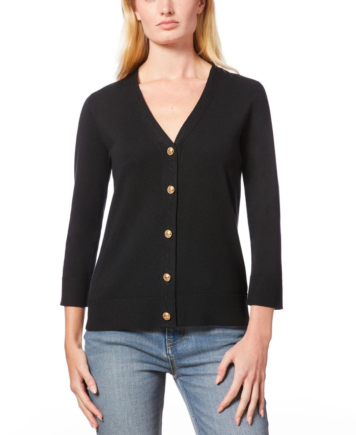 Melissa Paige's versatile V-neck cardigan takes your ensembles to the next level with cable-knit trim and 3/4-sleeves.