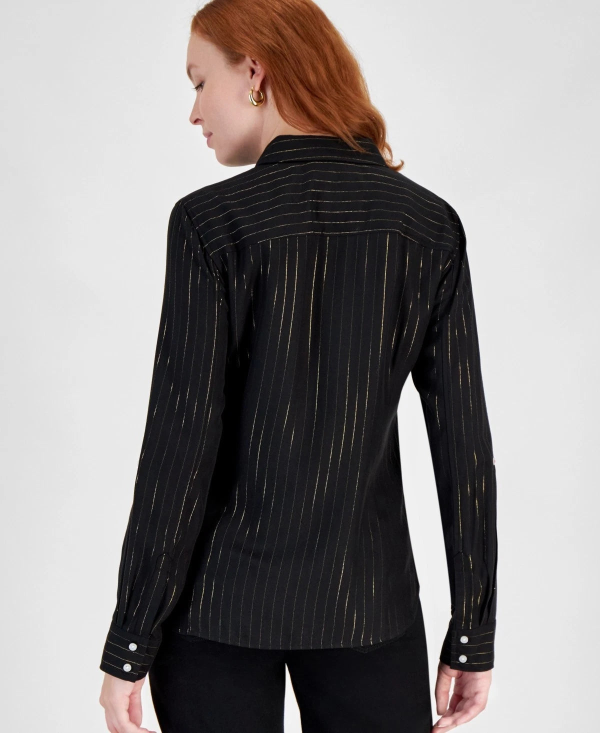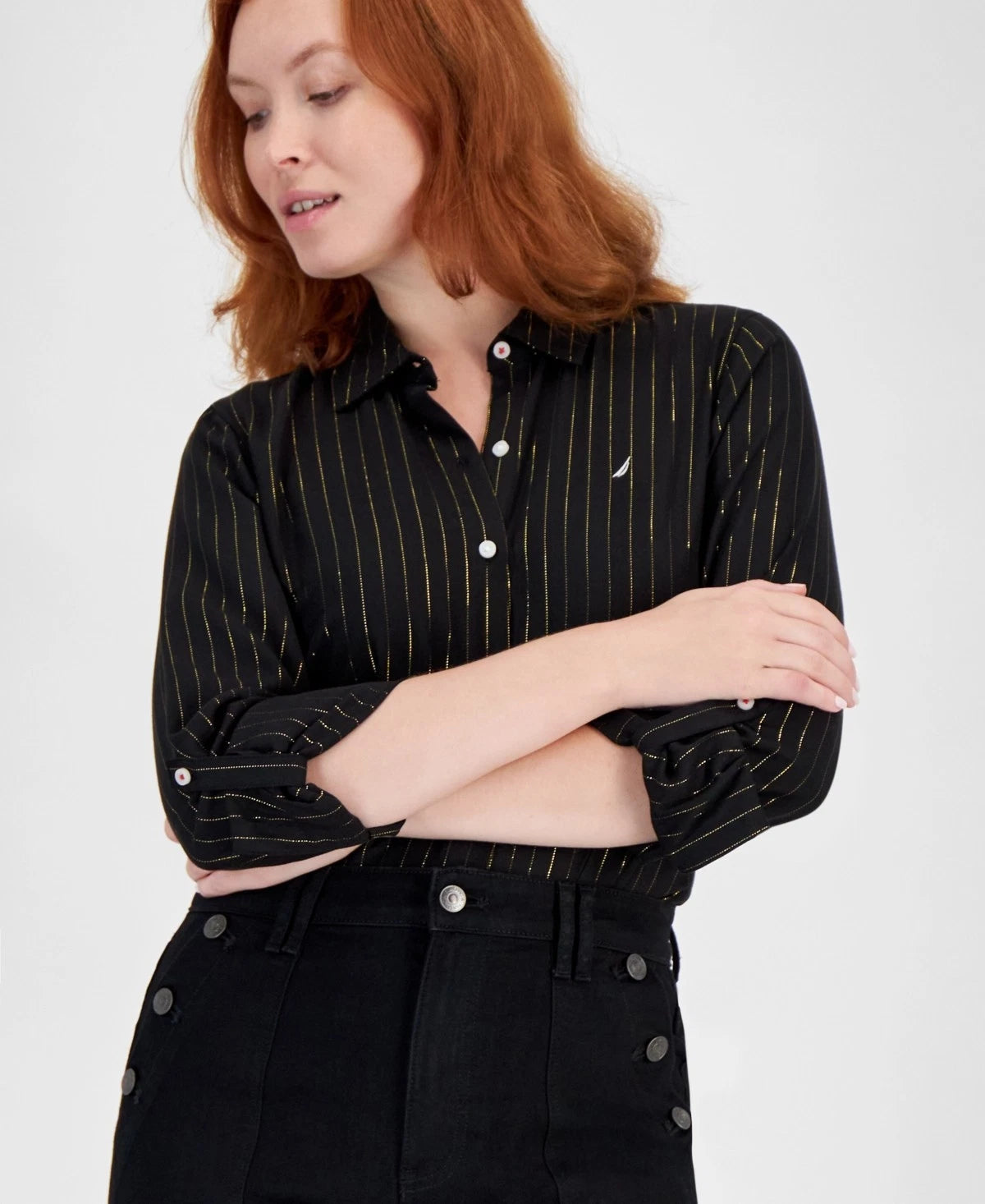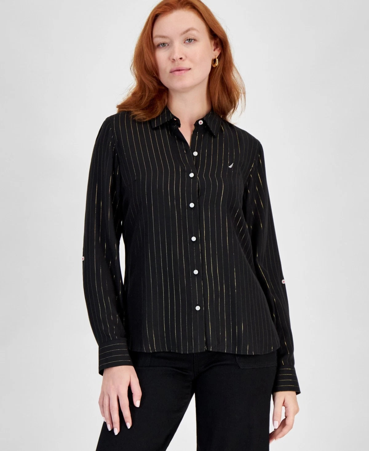 Nautica Jeans Flickering Pinstripe Roll-Tab-Sleeve Button-Up Shirt Black Gold Size S