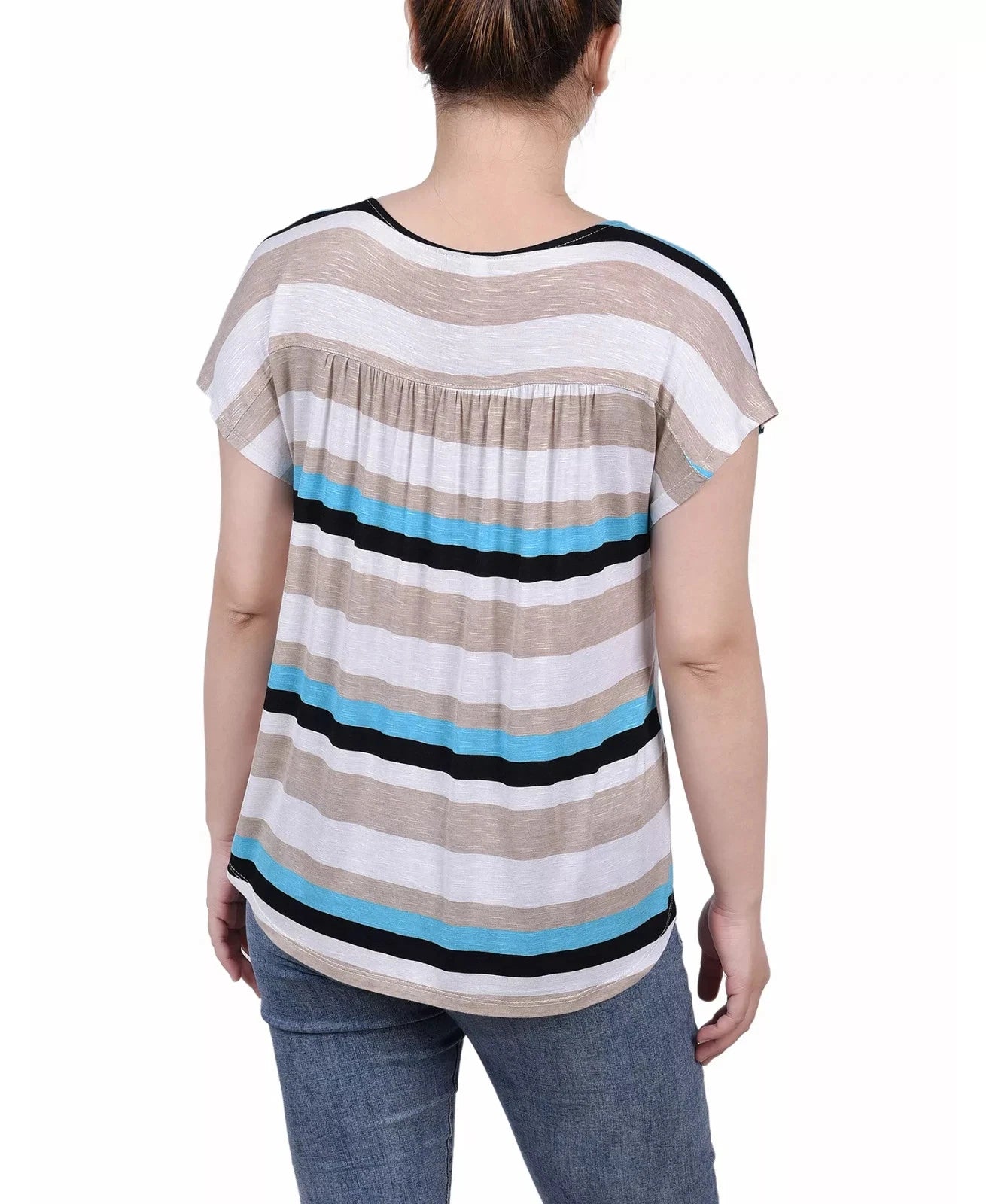NY Collection Petite Short Sleeve Striped V-neck Top Size PL Turquoise Blue