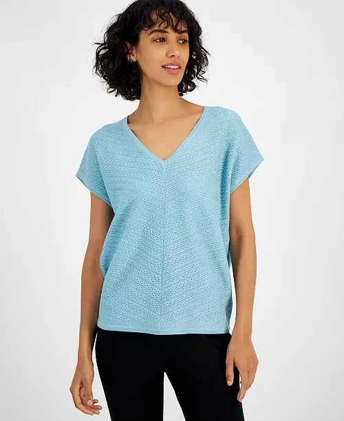 T Tahari Women's V-Neck Pointelle Cap-Sleeve Sweater Blue Size L MSRP $68