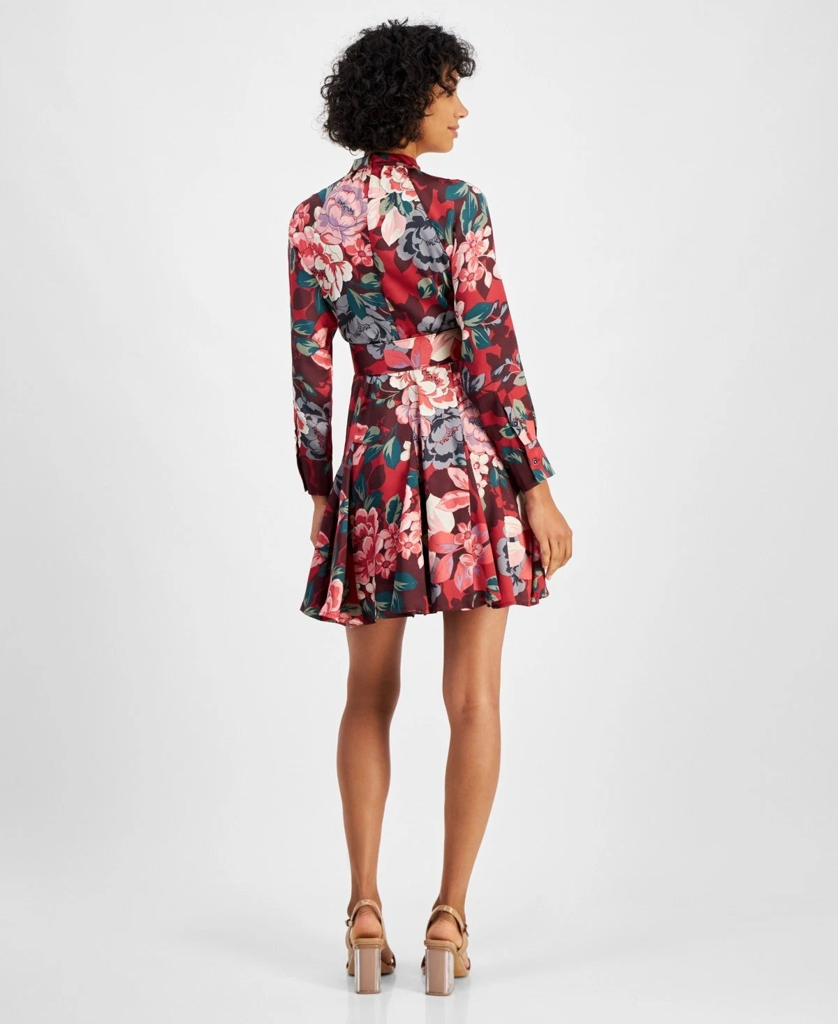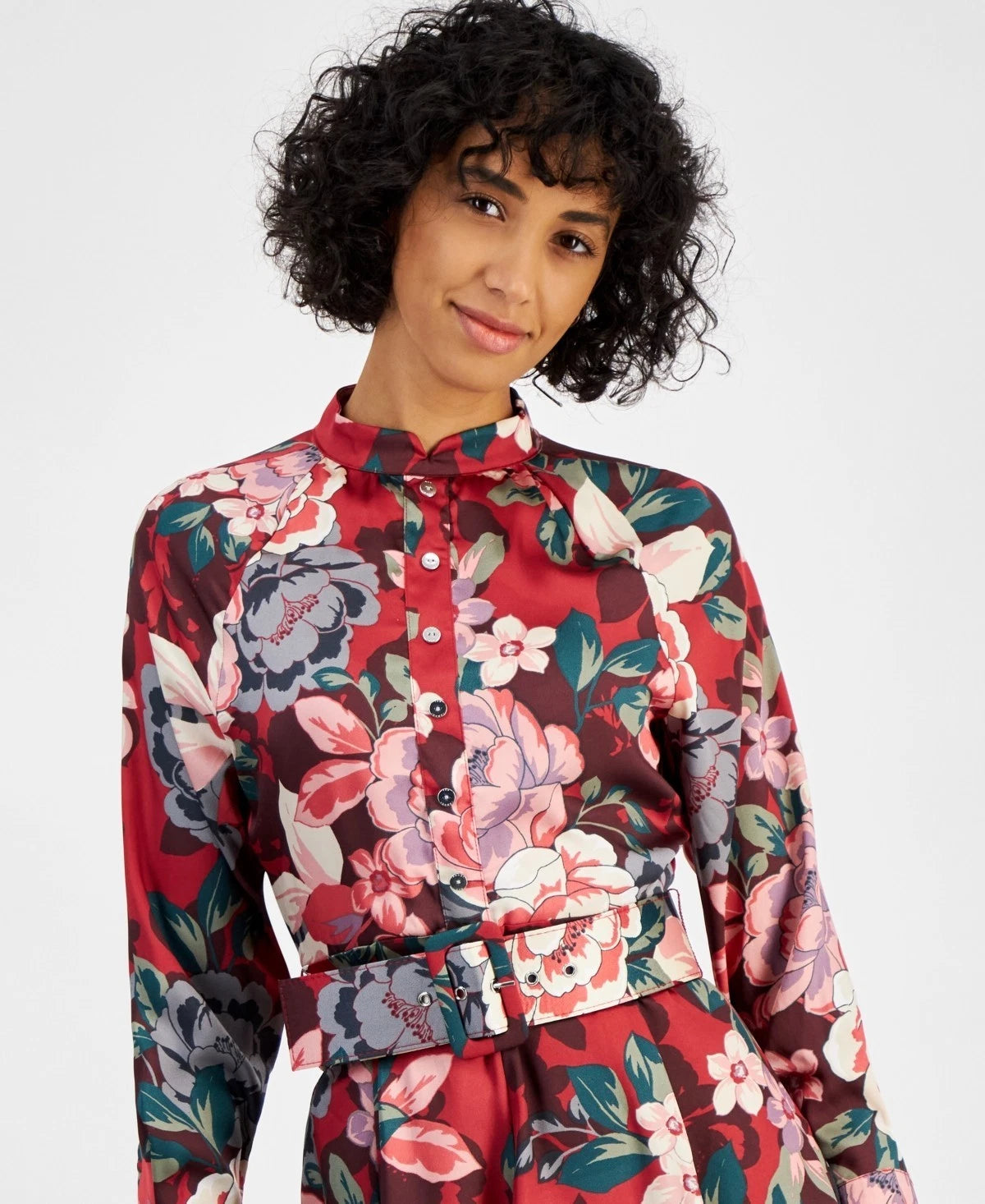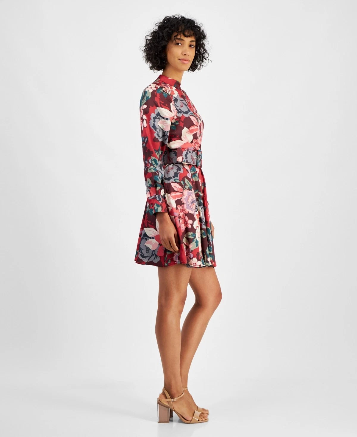 Tahari ASL Petite Floral Button-Trim Belted Long-Sleeve Dress Red Size 4P $159