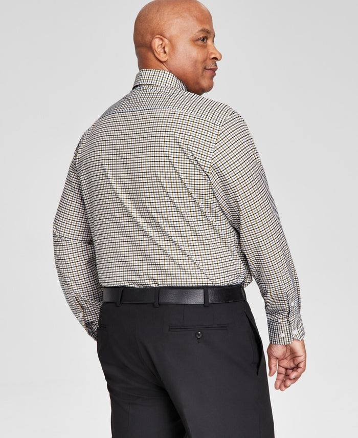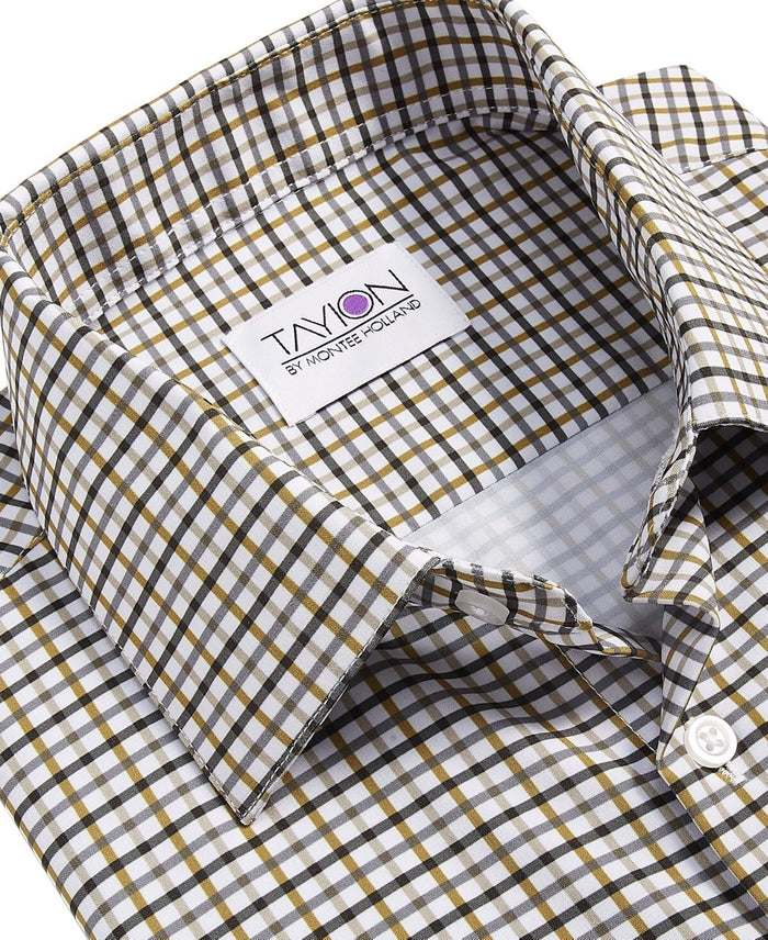 A powerhouse showcase of wrinkle-free, moisture-wicking design that leaves room for a hint of stretch, this slim-fit button-down from Tayion Collection comes complete with an intricate black and gold plaid pattern.