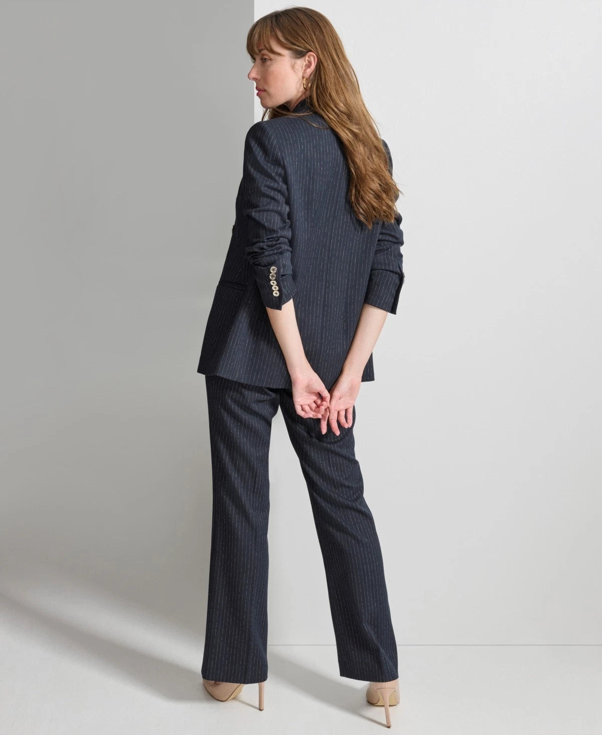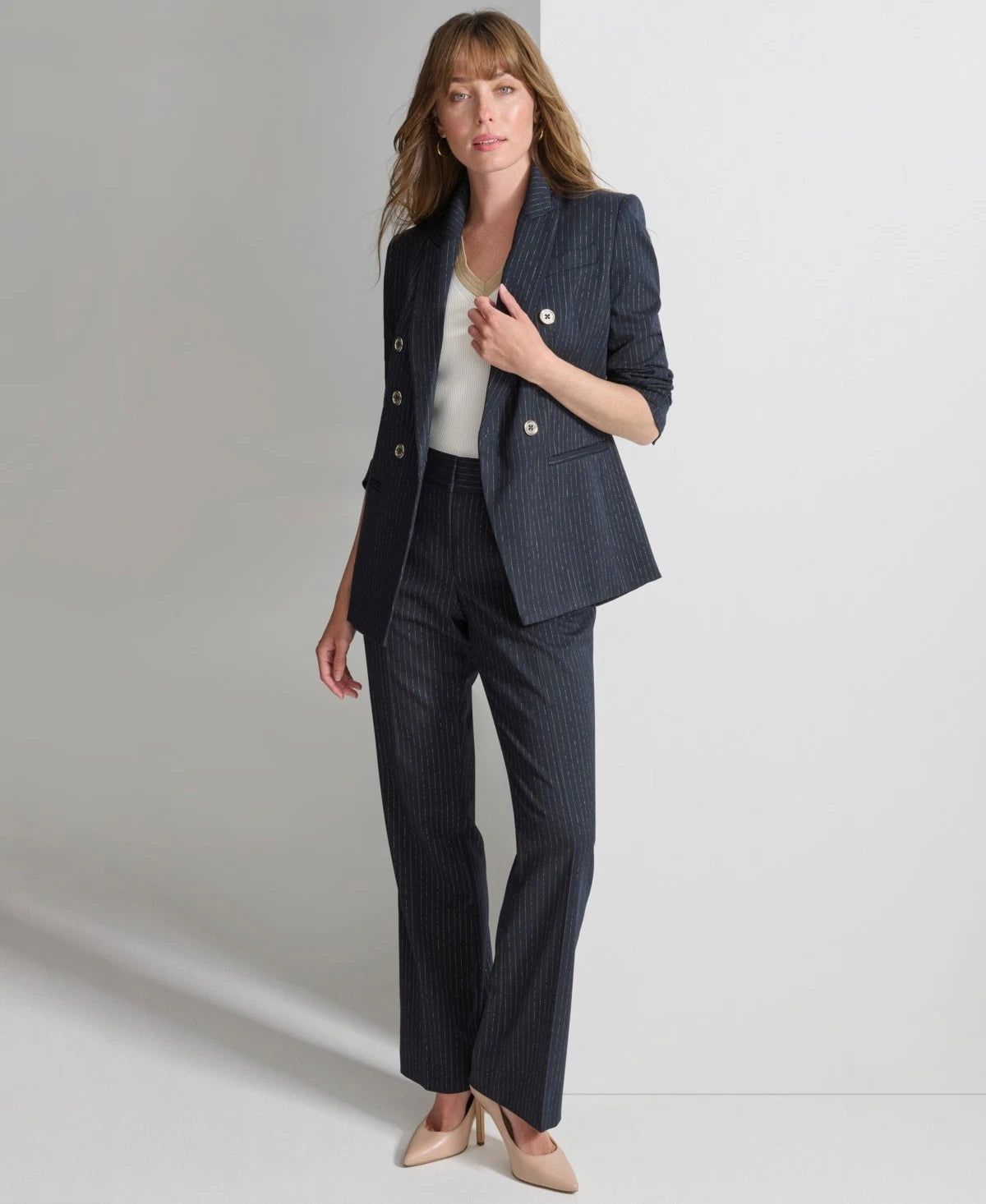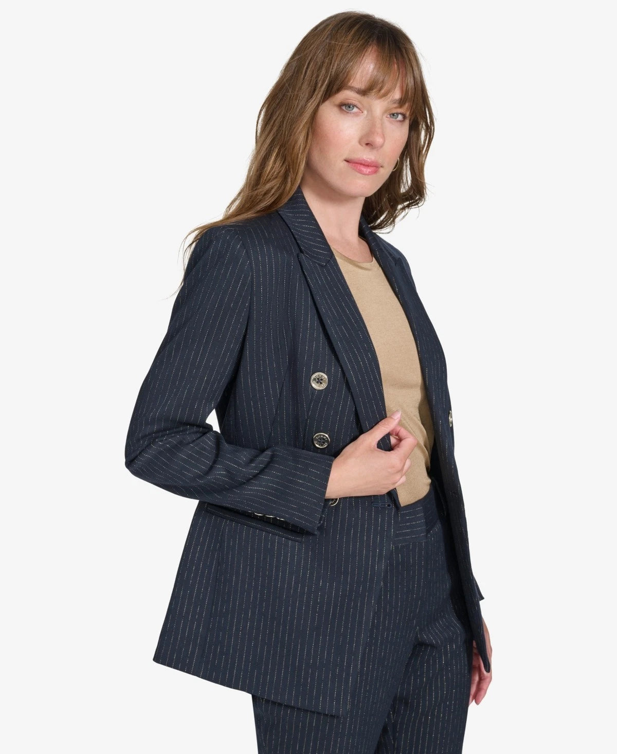 Metallic pinstriping elevates your workday look in this double-breasted Tommy Hilfiger blazer.