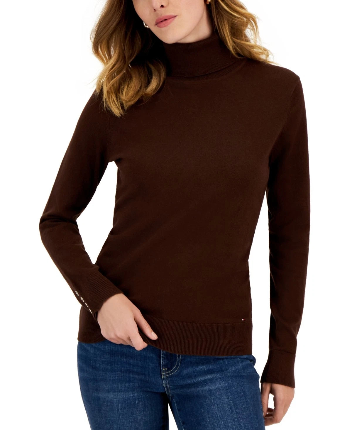 Tommy Hilfiger Women Button-Cuff Turtleneck Stella Sweater Size S Brown MSRP $70