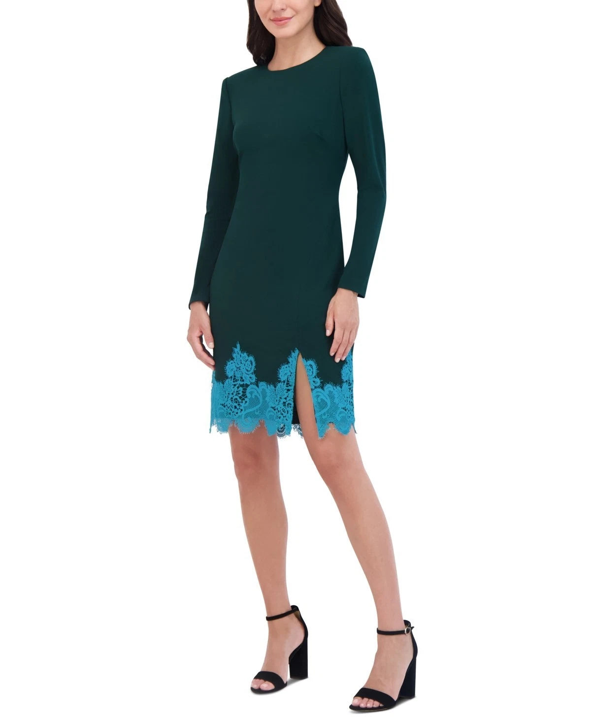 A bodycon that hugs you in all the right places, this long-sleeve dress from Vince Camuto features a pretty lace ham and front slit.