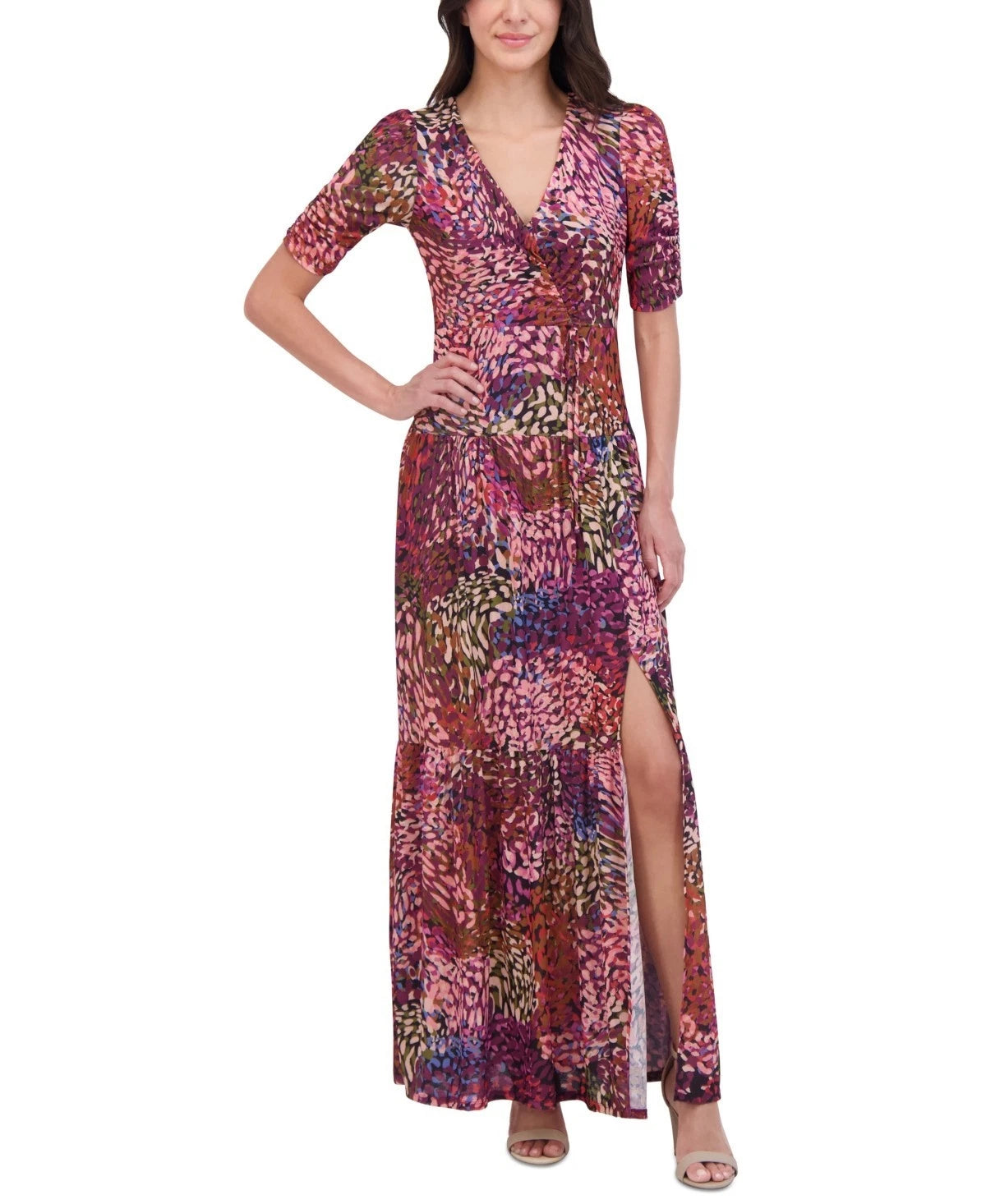Make a statement with this women's printed maxi dress from Vince Camuto, featuring adjustable shirring and a high front slit for a stunning and customizable fit.