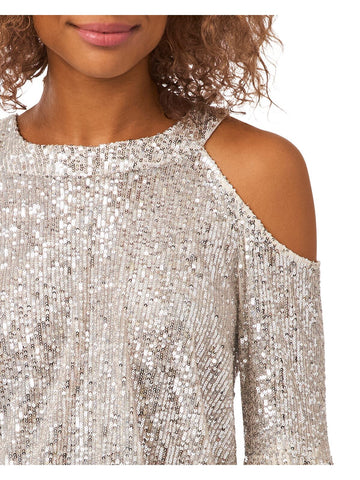 CECE Womens Beige Cold Shoulder Sequined Keyhole Balloon Sleeve Blouse Size XS