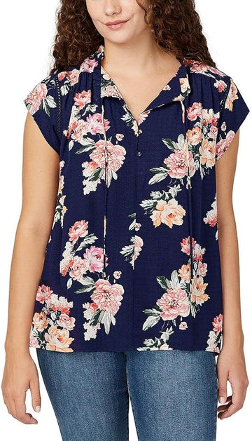 Lucky Brand Women's Split Neck Printed Peasant Blouse Size L Cream Multi