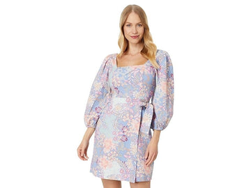 Michael Kors Foil-Print Smocked Peasant Dress Turquoise Blue Size S MSRP $125