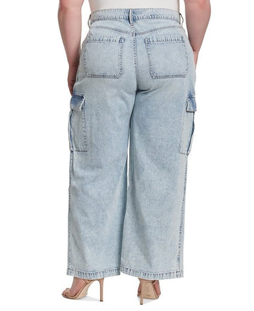Score a trending look with these plus size cargo jeans from Jessica Simpson.*Features** Approx. inseam: 29-1/2"** High rise: approx. 14-1/2'"; leg opening: approx. 25"** Zip fly with front button closure;...