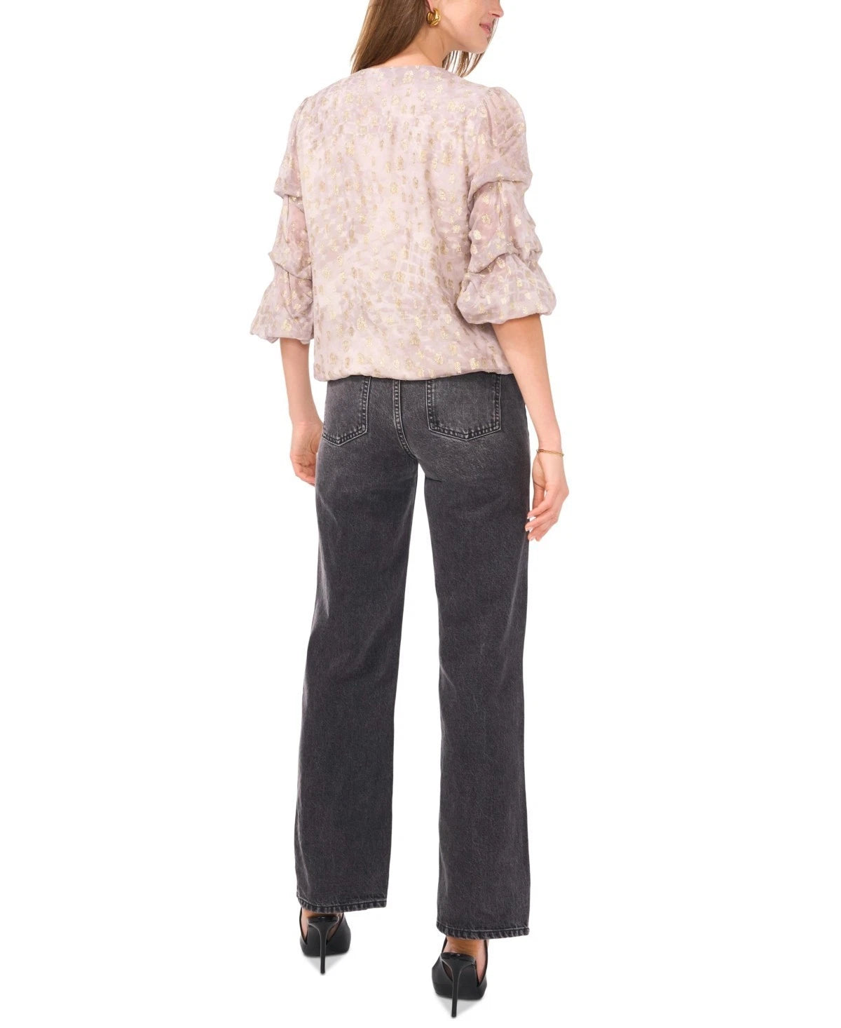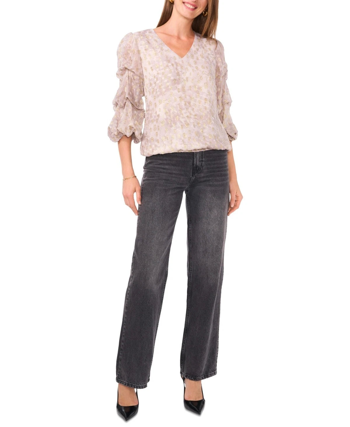 Scrunched sleeves and a subtle print lend an air of elegance to this V-neck blouse by Vince Camuto. ABOUT THE BRAND: Vince Camuto is a globally renowned brand that embodies European styling. Detailed craftsmanship across the line embraces current trends while maintaining a classic aesthetic.