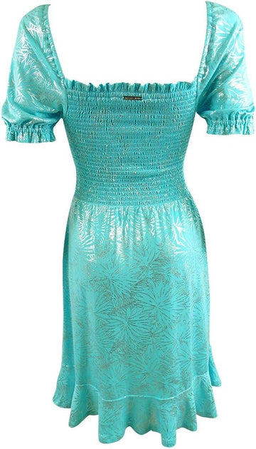 Michael Kors Foil-Print Smocked Peasant Dress Turquoise Blue Size S MSRP $125