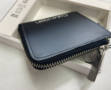 Calvin Klein Men RFID Zip Card Wallet Gusset C Black Gray Leather MSRP $50