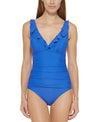 DKNY LAPIS Ruffle Plunge Underwire Tummy Control One-Piece Swimsuit Size 6 Blue