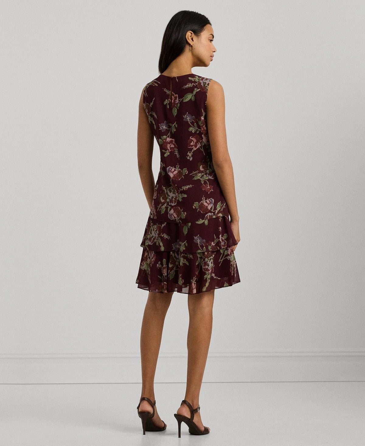 Timeless elegance defines this sleeveless Lauren Ralph Lauren dress, which pairs a vintage-inspired shift silhouette with airy crinkle georgette and a tiered skirt, creating fluid movement with each step. This iteration is updated with the season's romantic floral motif.