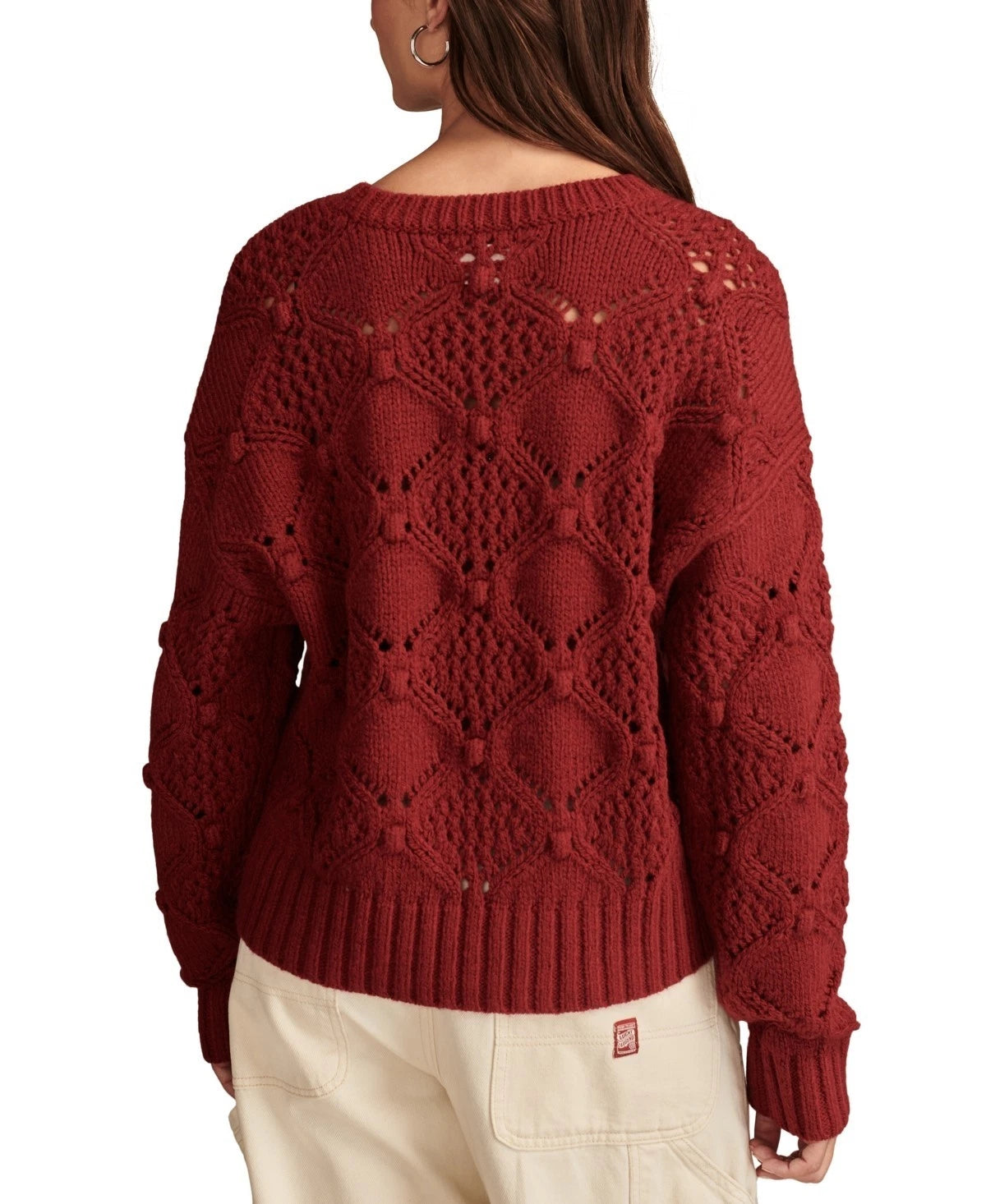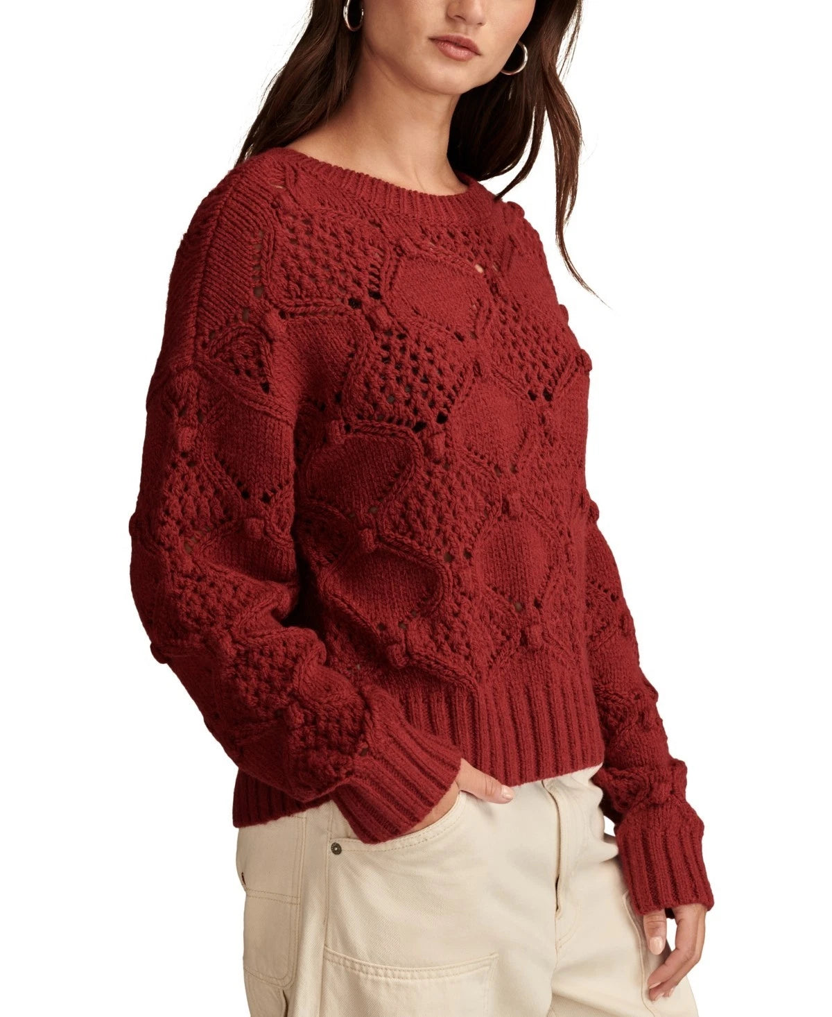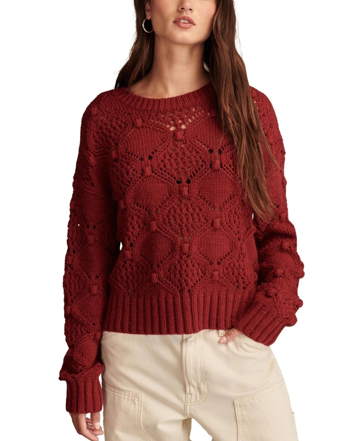 Textured with bobbles and breezy with open-stitch detailing, this Lucky Brand crewneck sweater is a fresh find for any day of the week.