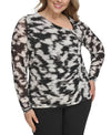 Calvin Klein Plus Size Printed Asymmetric Ruched Top Black Size 1X MSRP $79