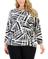 Kasper Plus Size 1X Abstract-Print 3/4 Sleeve Side-Tie Top Black White MSRP $79