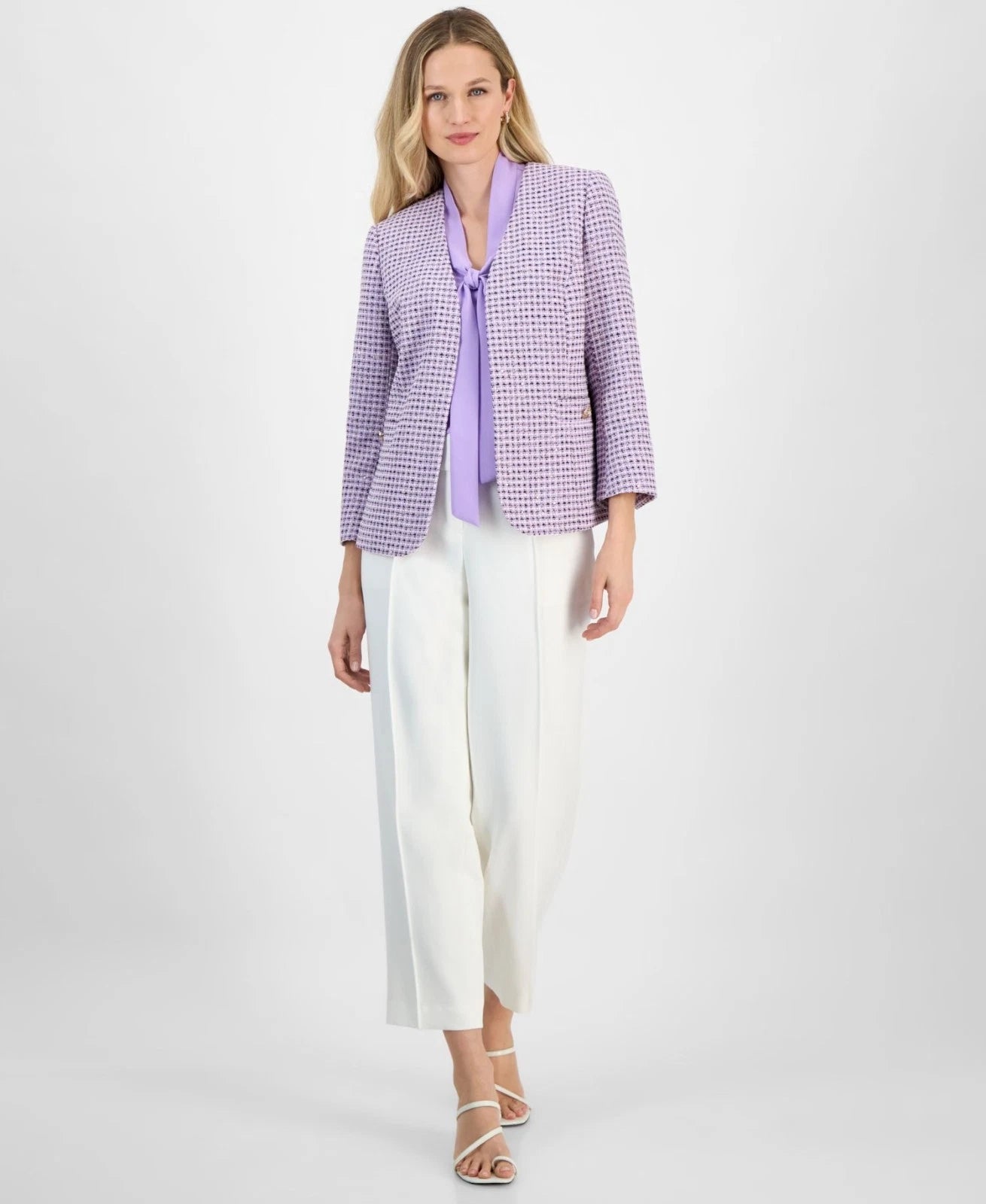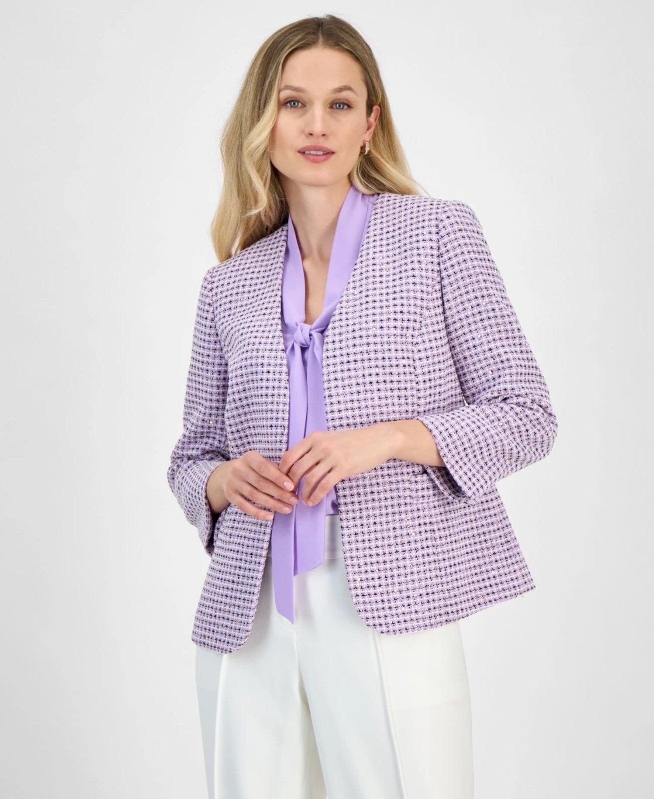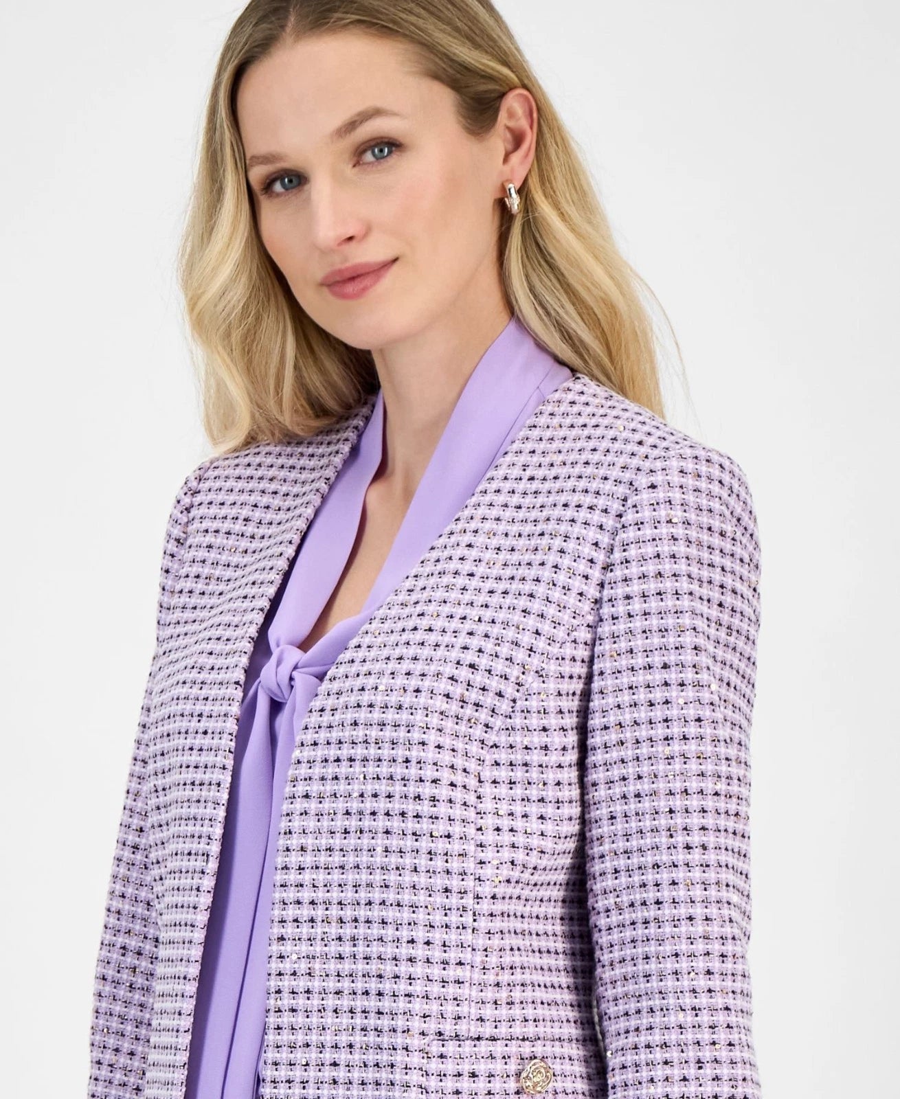 Kasper takes a classic and timeless tweed style and adds a contemporary twist thanks to a collarless design and open front silhouette.