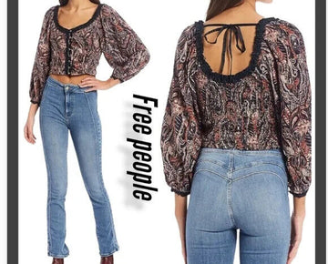 Free People Dare Me Tie-Back Velvet Blouse Navy Blue Orange Size XL MSRP $128