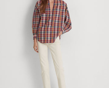 LAUREN RALPH LAUREN Women's Cotton Madras Tie-Neck Blouse Pink Size XL MSRP $115