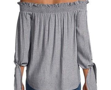 PRODUCT DETAILSFits true to size, order your normal sizeModel measurements: 5'10" height, 33.5" bust, 23.5" waist, 34.5" hips, wearing a size small/4Ruched off-the-shoulder neckline with ruffled trimLong sleeves, tied cuffsShirttail...