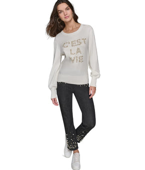KARL LAGERFELD C'est La Vie Faux-Pearl-Embellished Sweater Ivory Size XL MSRP$99