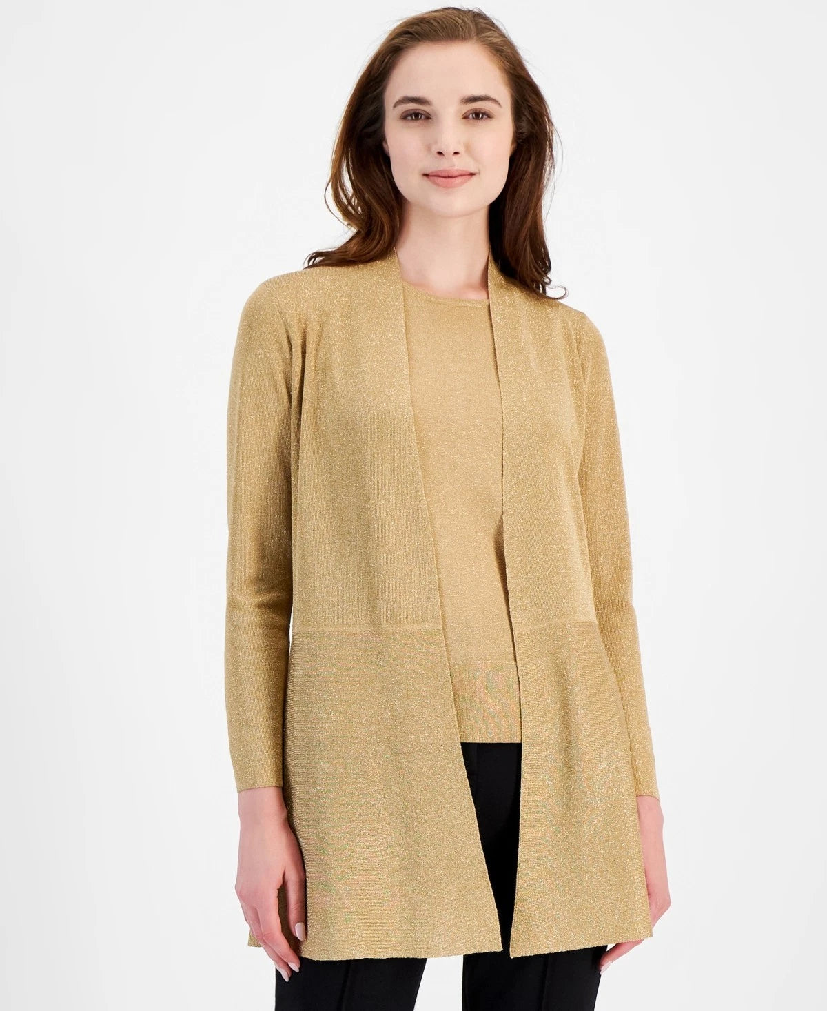 Add a touch of effortless elegance to your work attire with this Anne Klein women's shimmer open-front cardigan, perfect for layering with style and comfort.