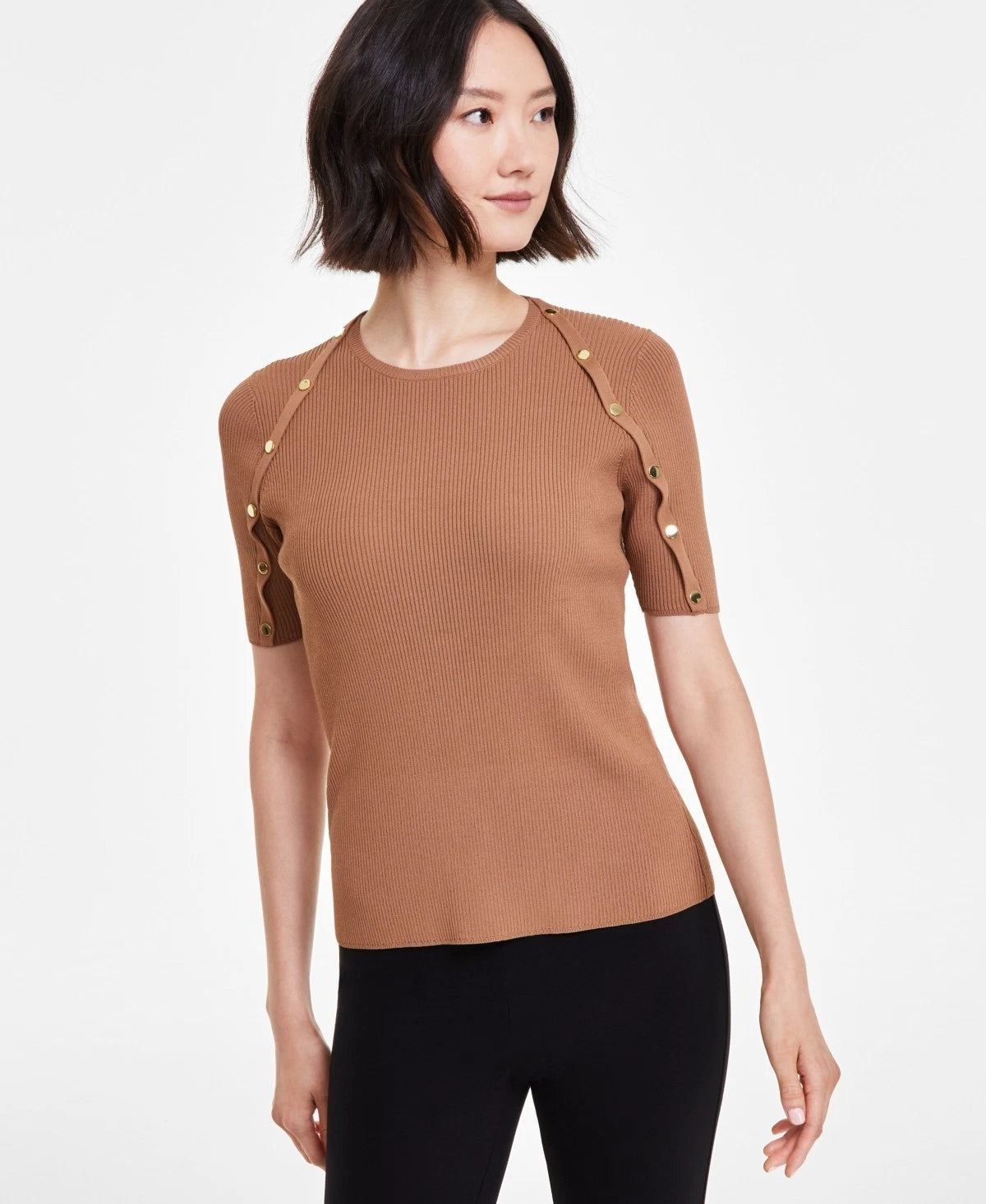 Slanted plackets shine with button trim on Anne Klein's ribbed-knit top, an effortless option for workday wear.