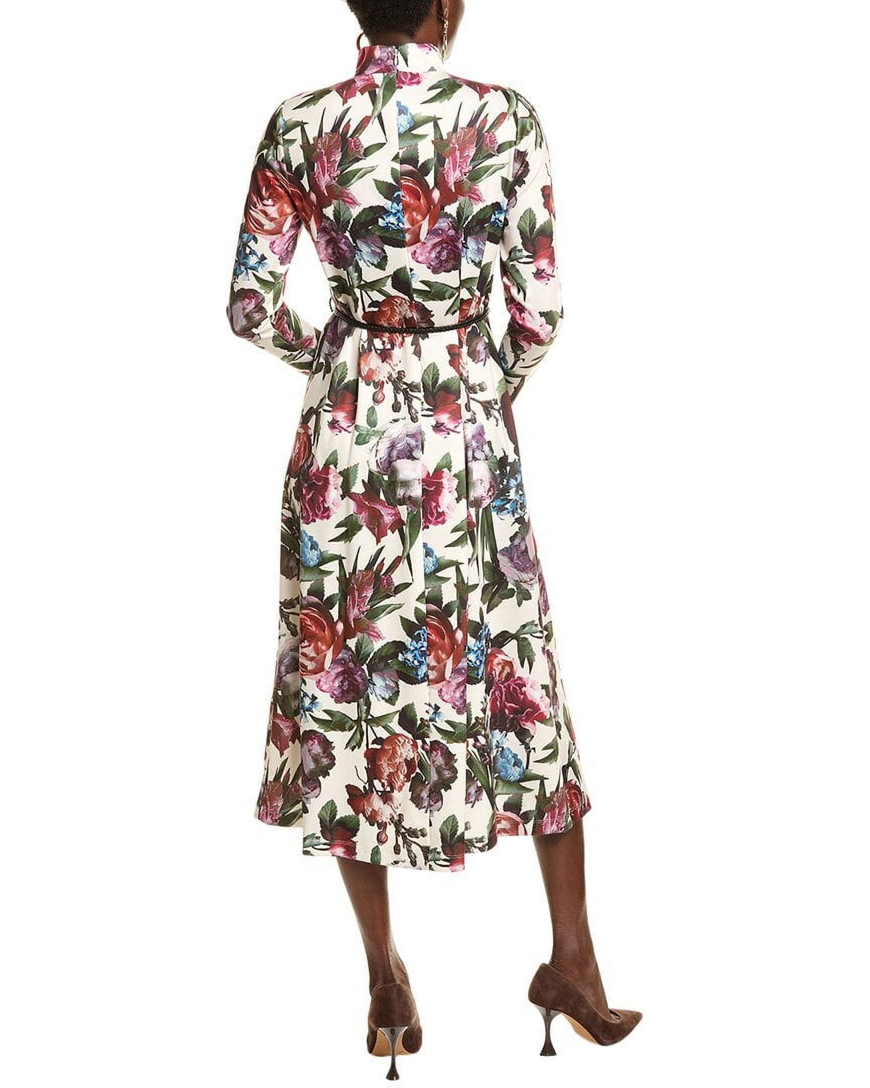 About the brand: Feminine designs for the global woman. Mock Neck Printed Midi Dress in pink tint multi with mock neck, braided belt at waist and dual side seam pockets