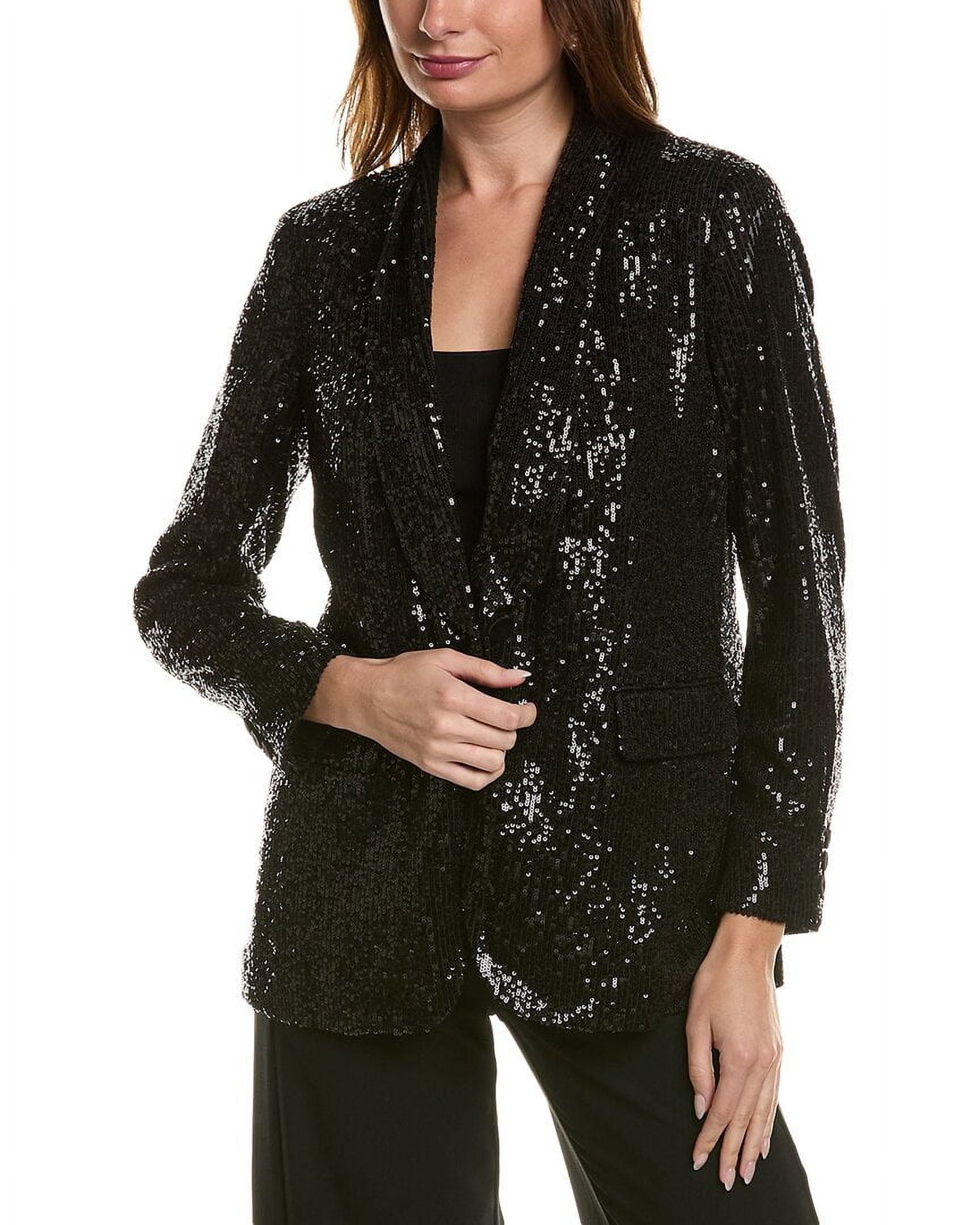 About the brand: Feminine designs for the global woman. Jacket in anne black with sequined design, dual front pockets, button cuffs, and vented back hem Approximately 28in from shoulder to hem Single-button front 95% polyester, 5% elastane Hand wash Imported