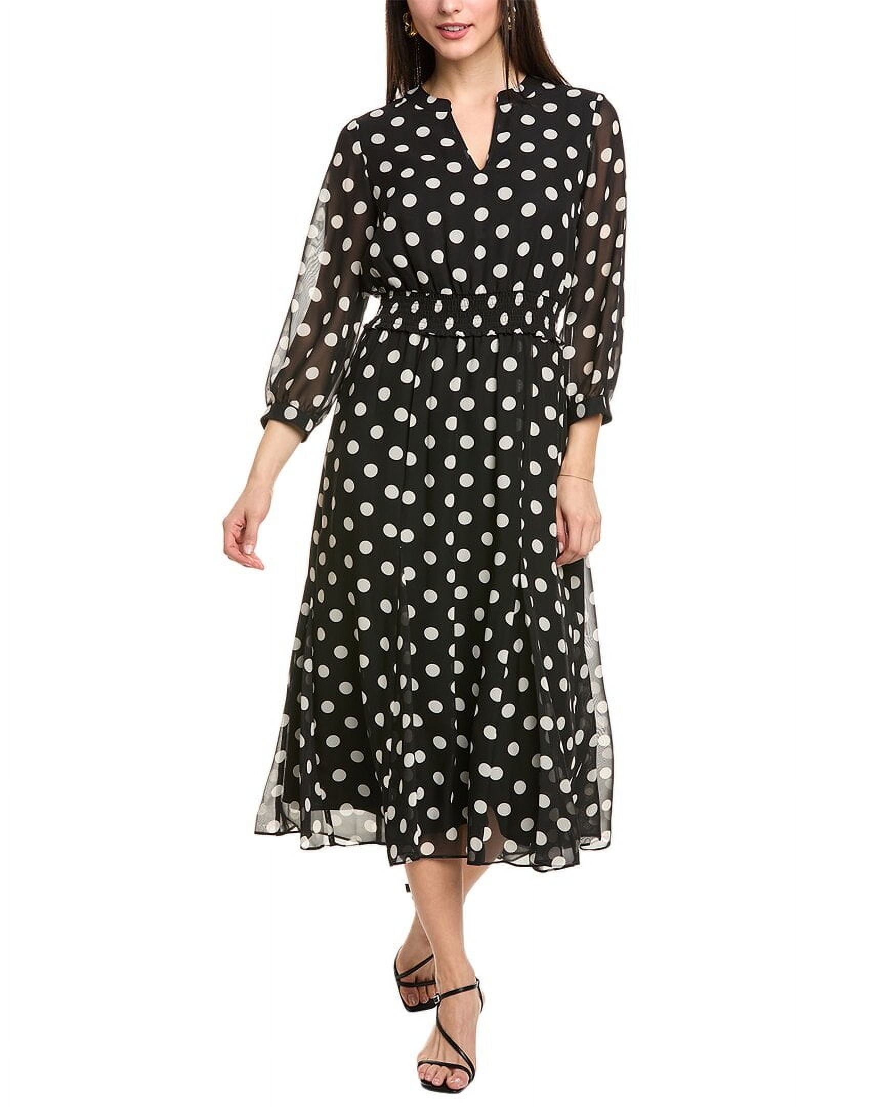 About the brand: Feminine designs for the global woman. Smocked Waist Collared Midi Dress in anne black/anne white with split neckline, smocked waist, sheer sleeves and godets at hem Slip-on styling 100% polyester Machine wash Imported