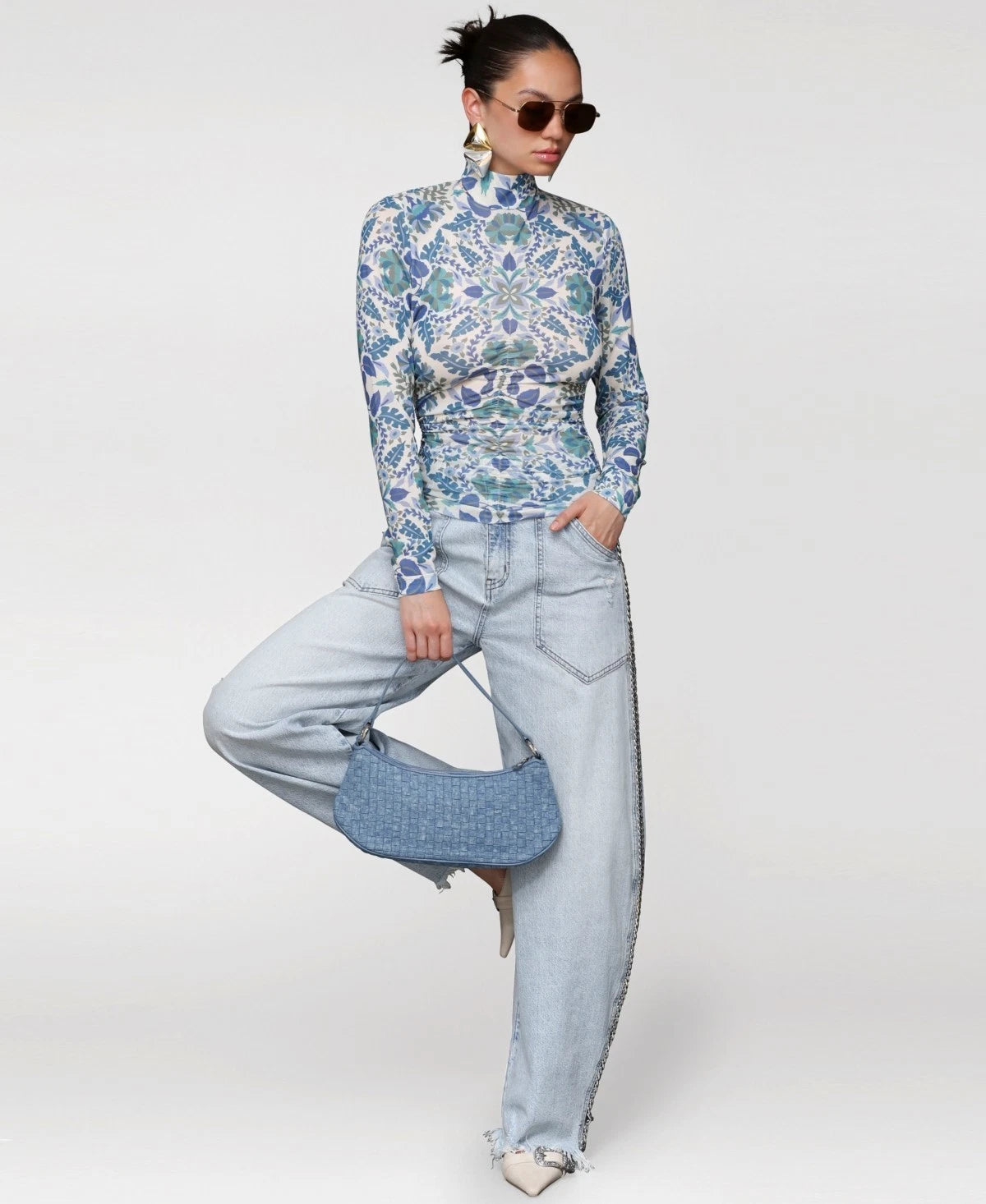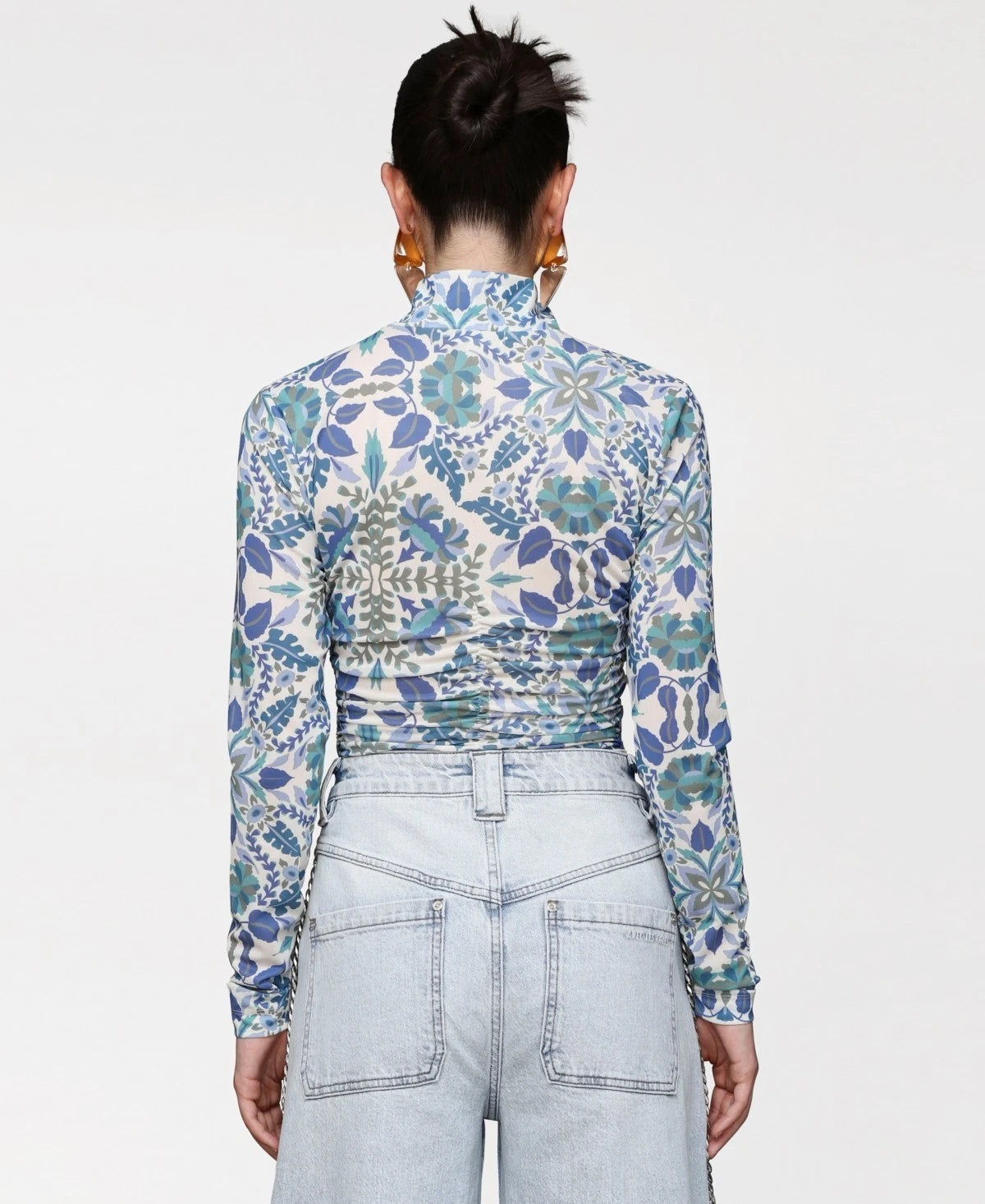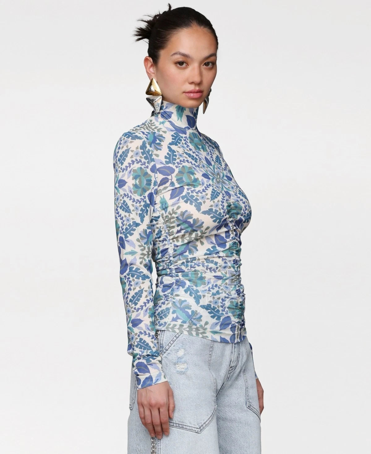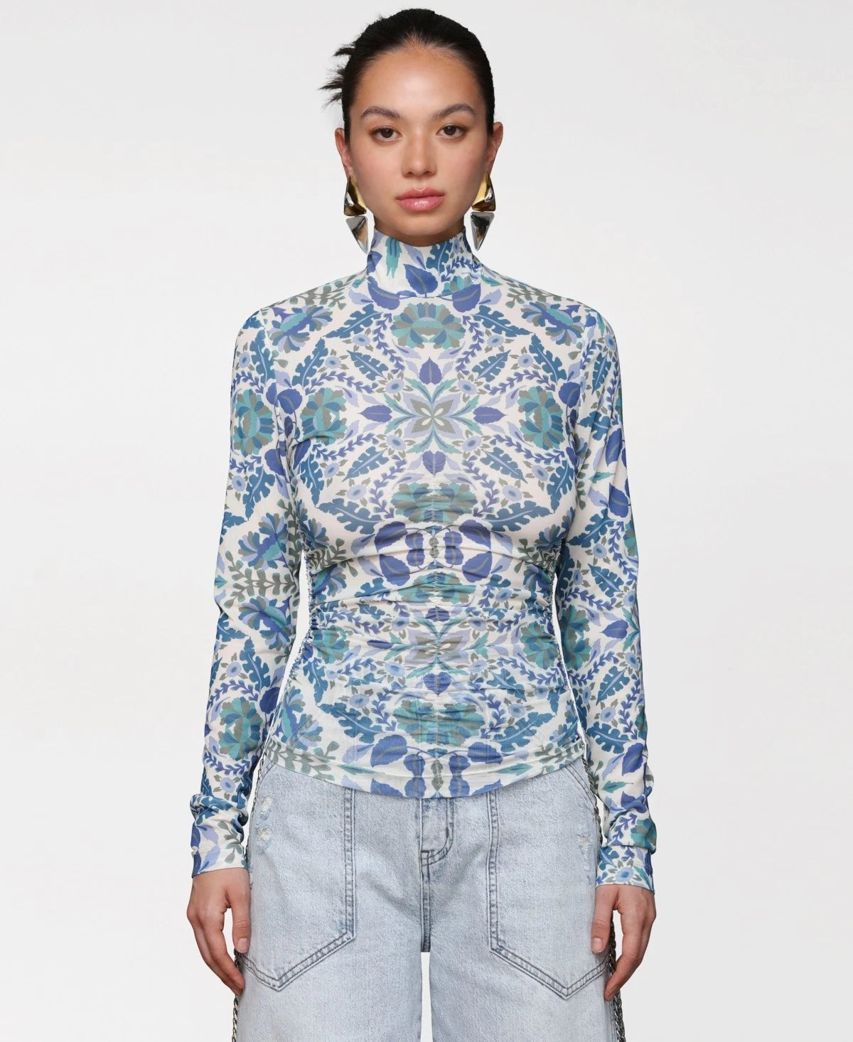 ** Imported ** Mock neck; pulls on ** Allover print; ruched sides and center front ** Long sleeves ** Unlined