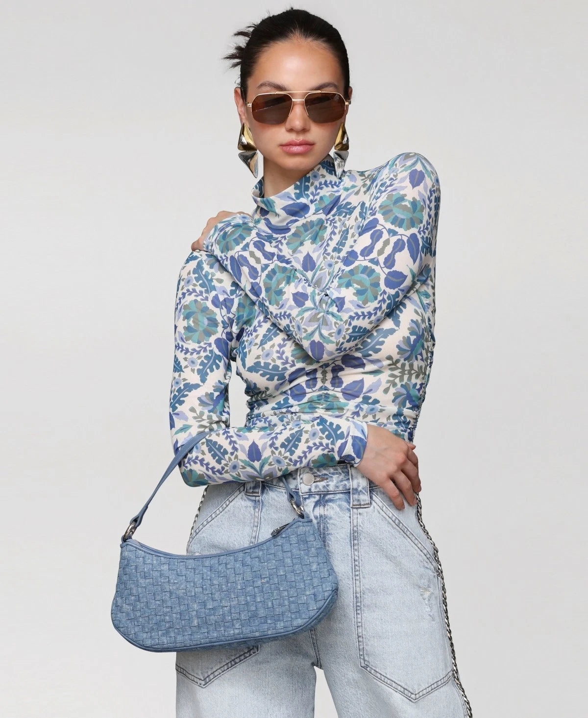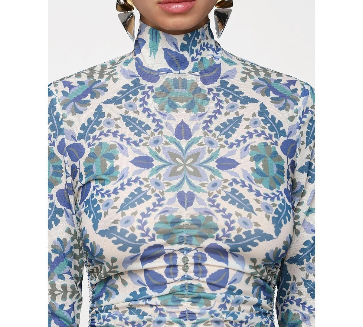 Avec Les Filles Women's Printed Mesh Mock Neck Ruched Top Blue Size XL MSRP $79