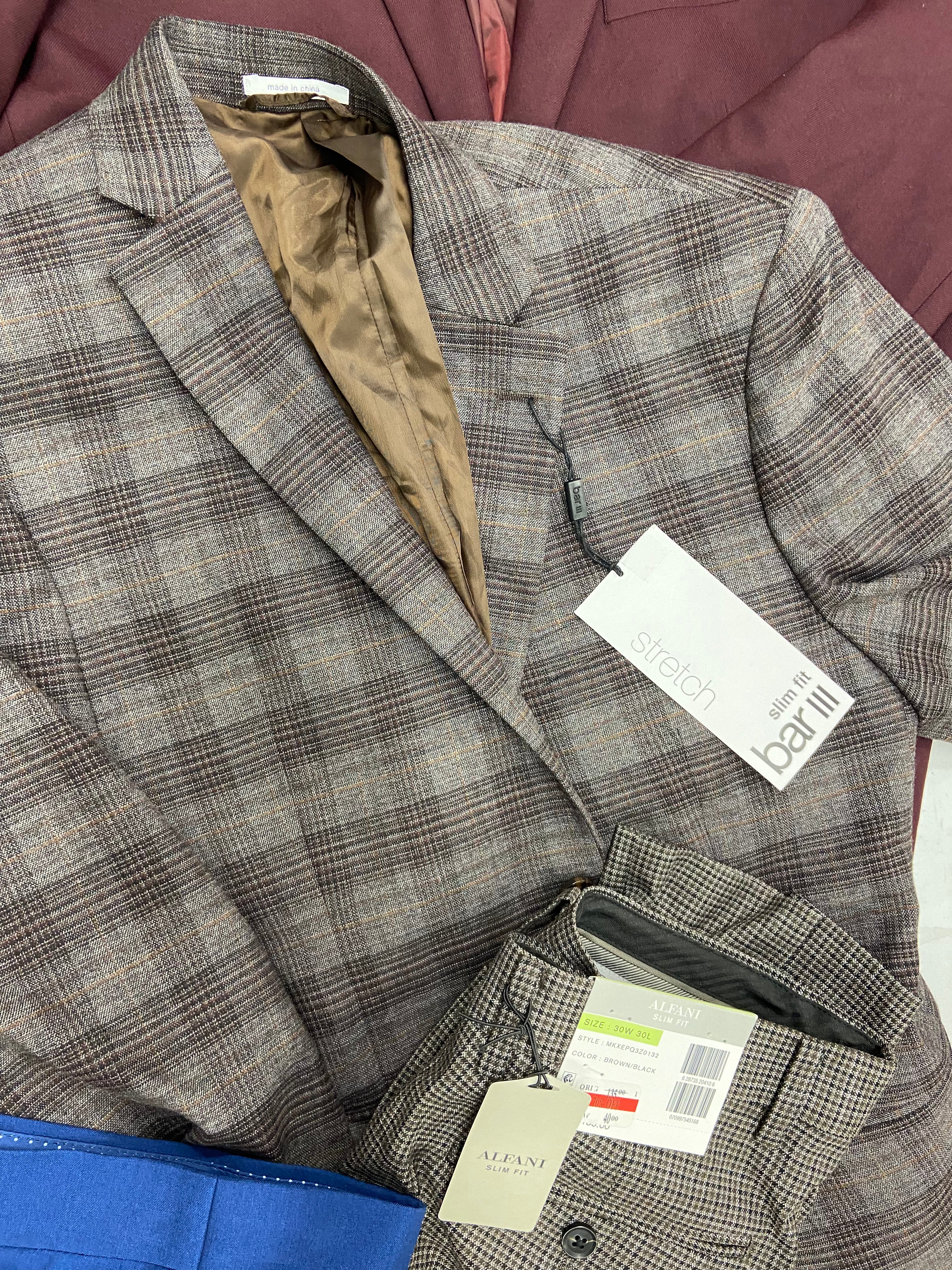 | Yes | 628735188529 | BAR III/PEERLESS CLOTHING | Bar III Mens Slim-Fit Plaid Blazer Grey Brown 38S | 1 | $295.00 | 38 SHORT | $295.00 |