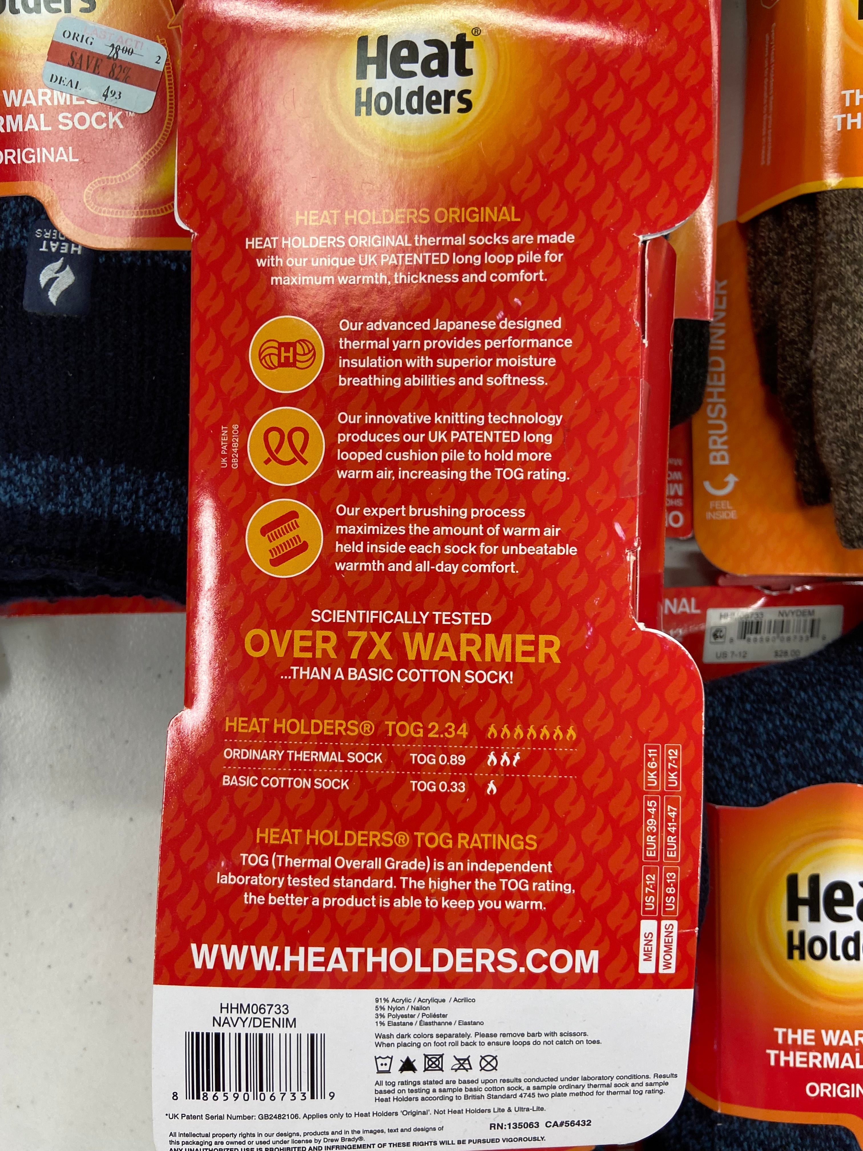 | Yes | 886590067377 | HEAT HOLDERS/DREW BRADY COMPANY INC | Warmest thermal sock | $22.00 | OSFA | 3 | $66.00 |