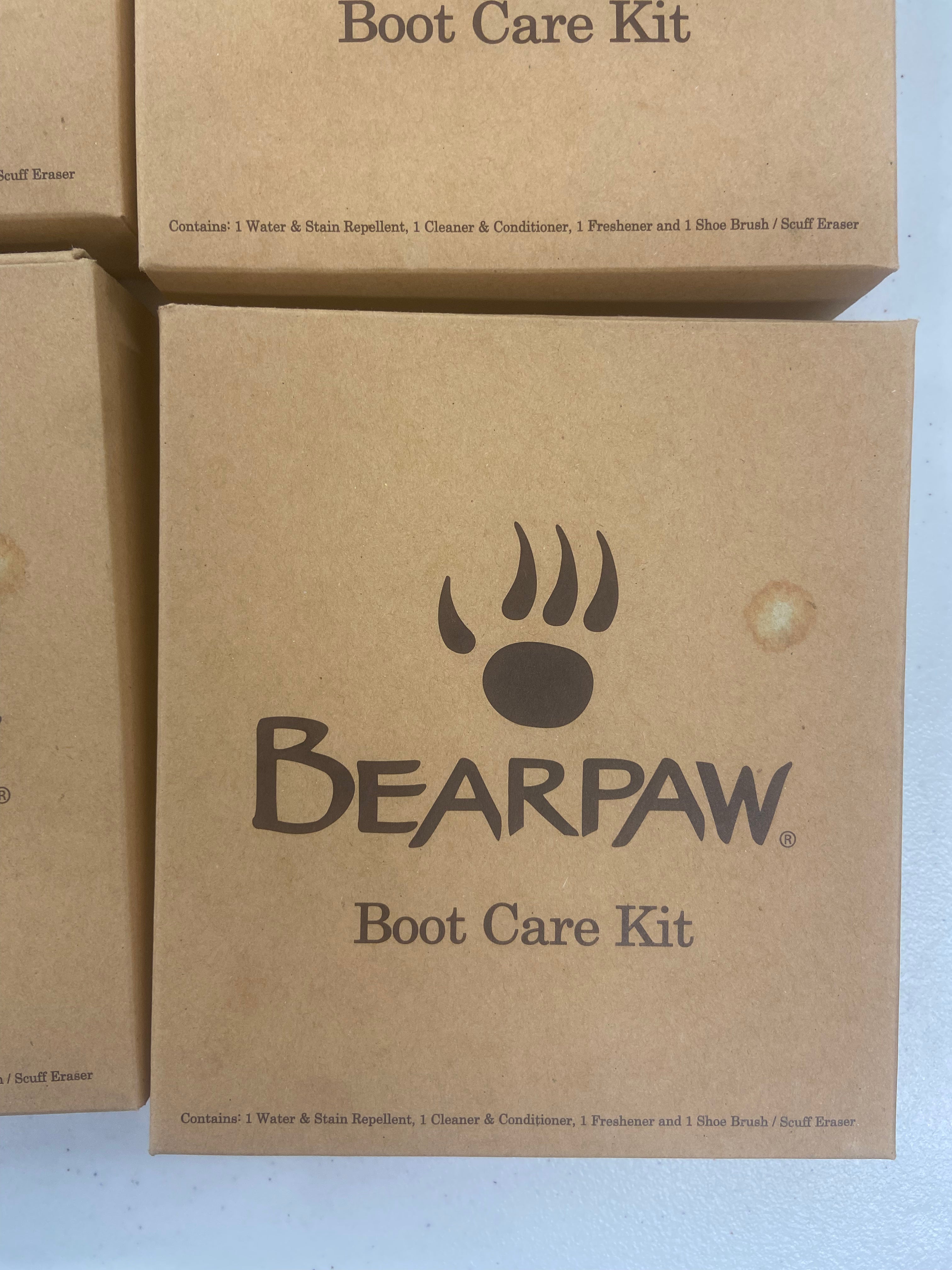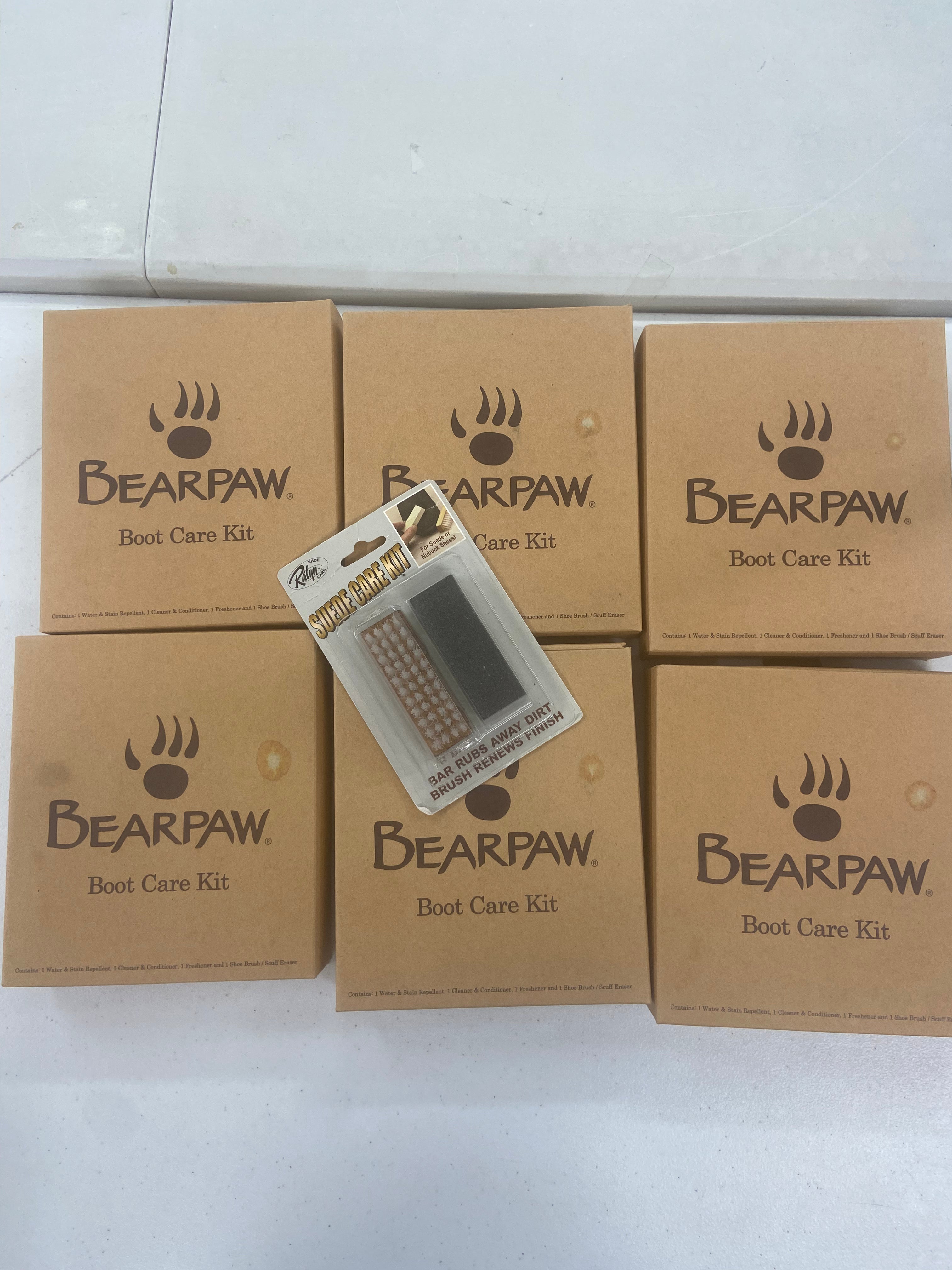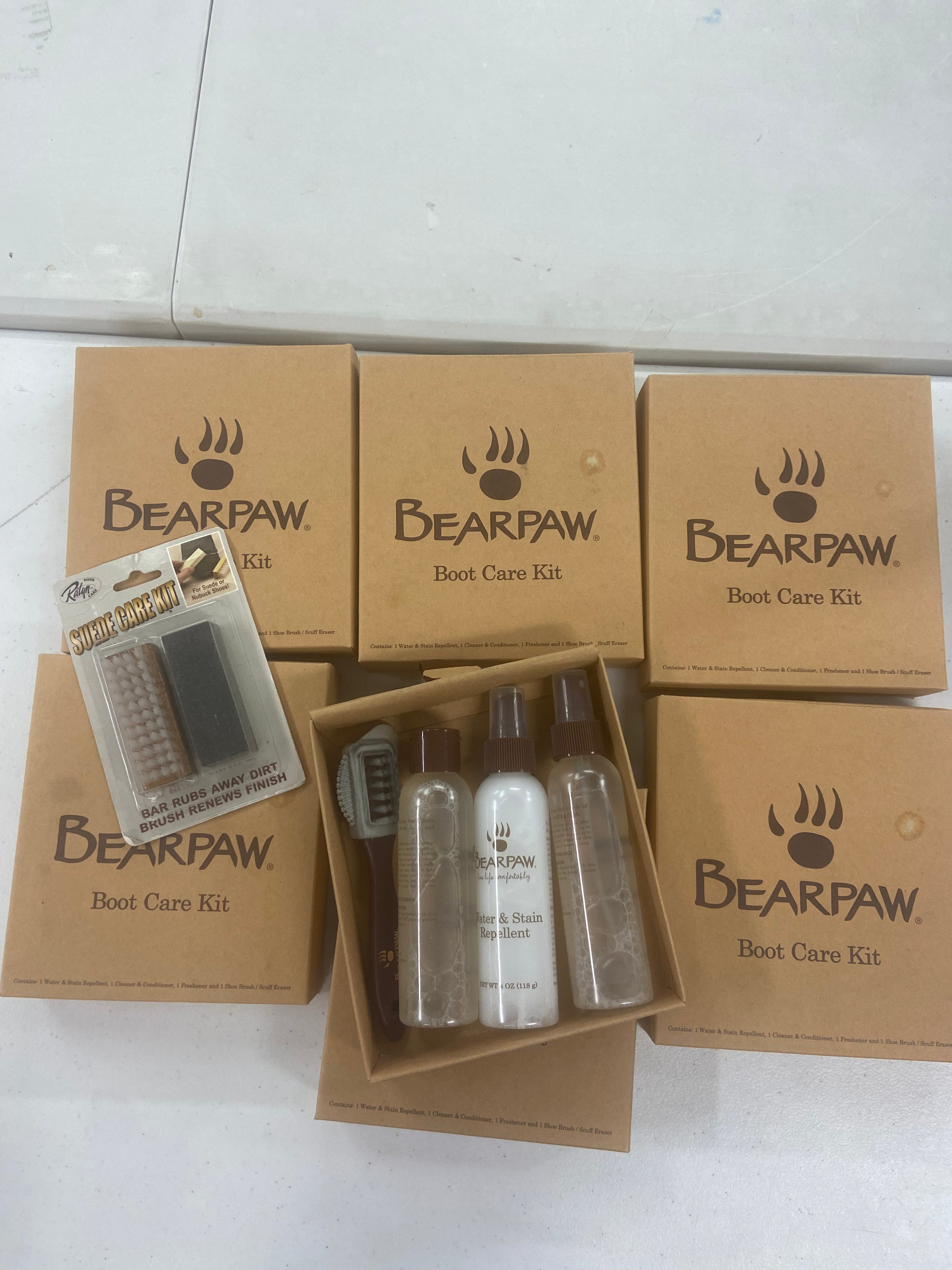 Bearpaw Boot Care Kit in new condition. Pack contains: 1 water and stain repellent, 1 cleaner and conditioner and 1 shoe brush/scuff eraser. |