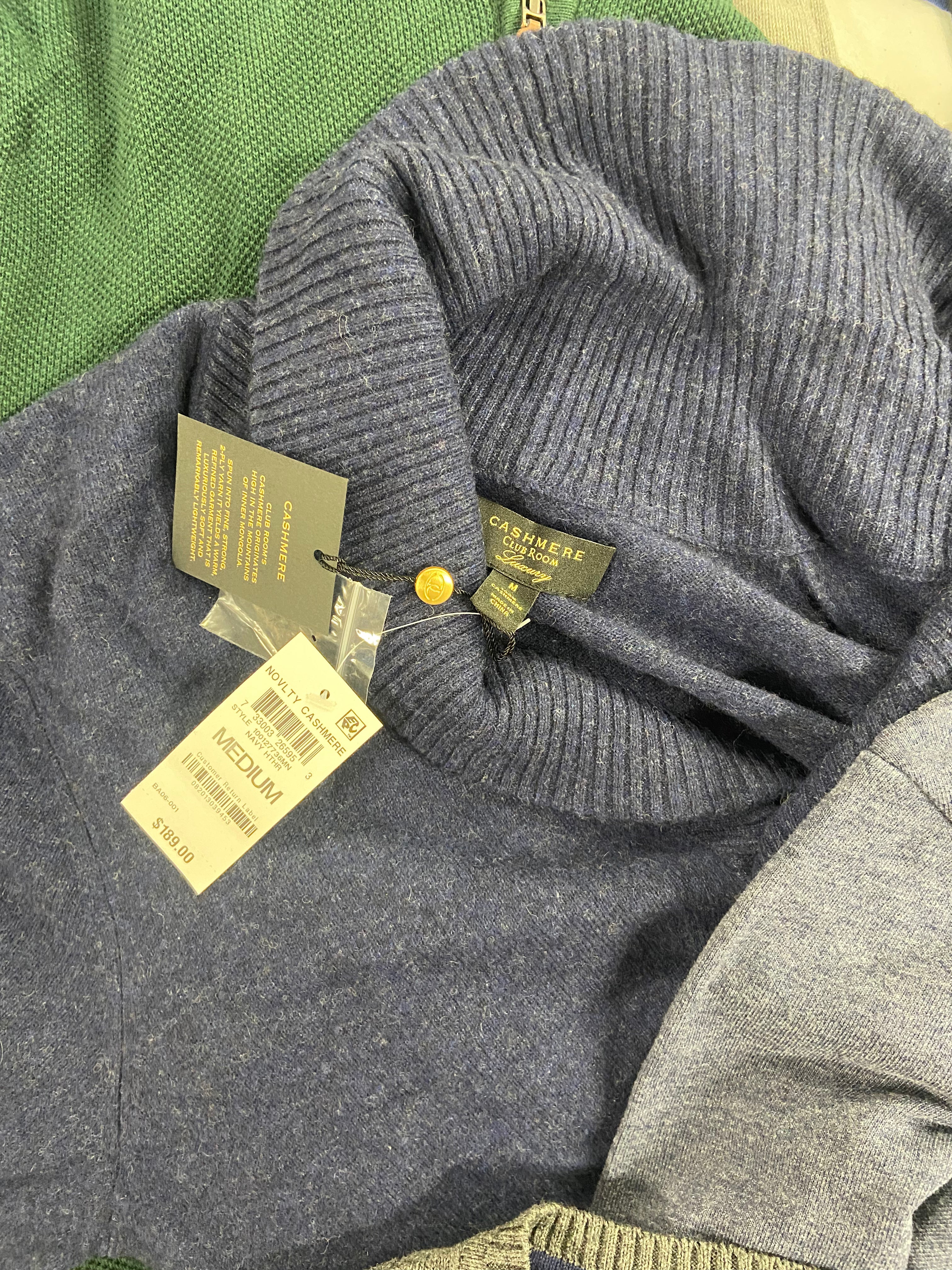 | Yes | 733003265953 | CLUB ROOM | Club Room Mens Shawl-Neck Cashmere Card Navy Heather M | $ 189.00 | MEDIUM S/S | 1 | $189.00 | |
