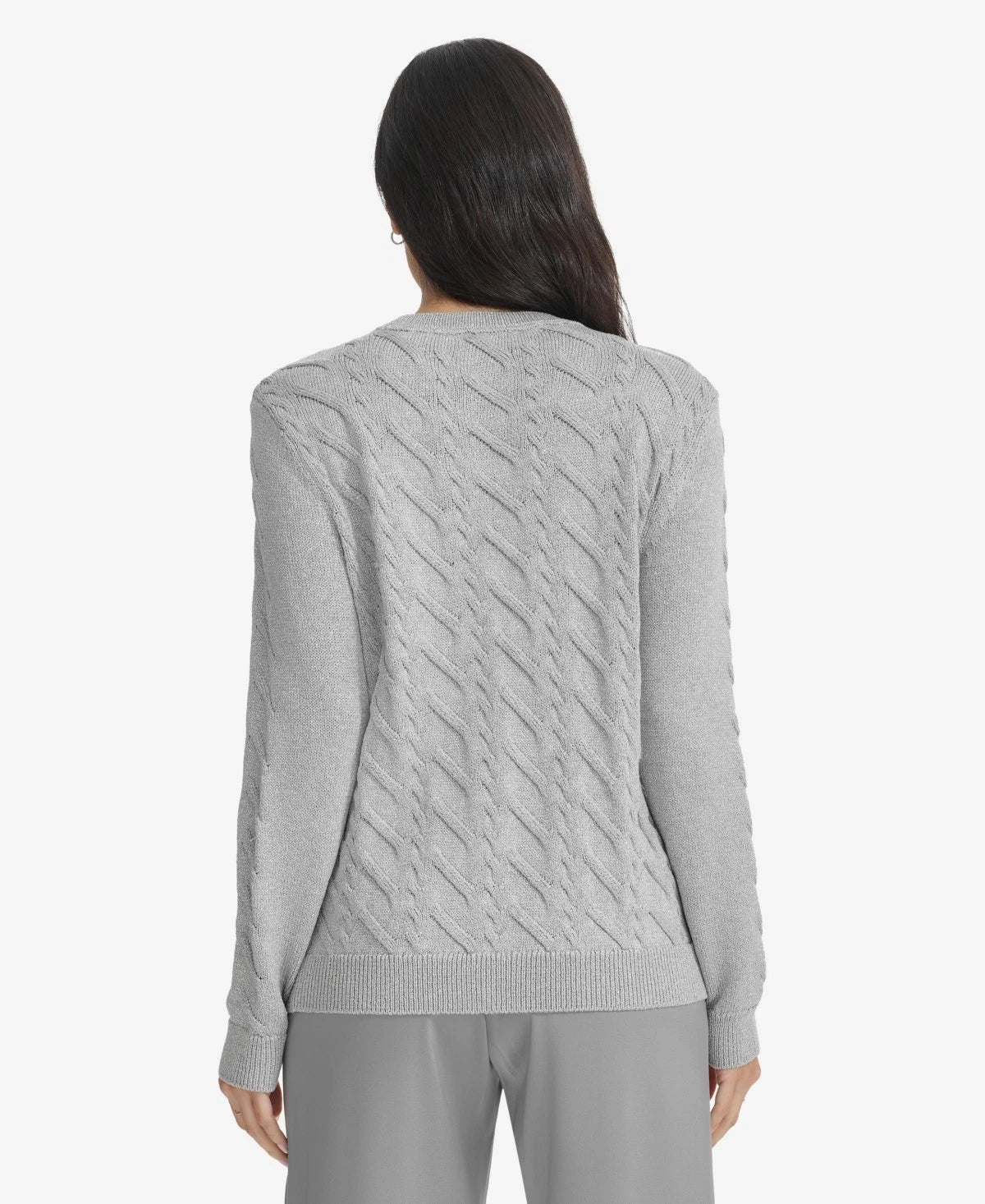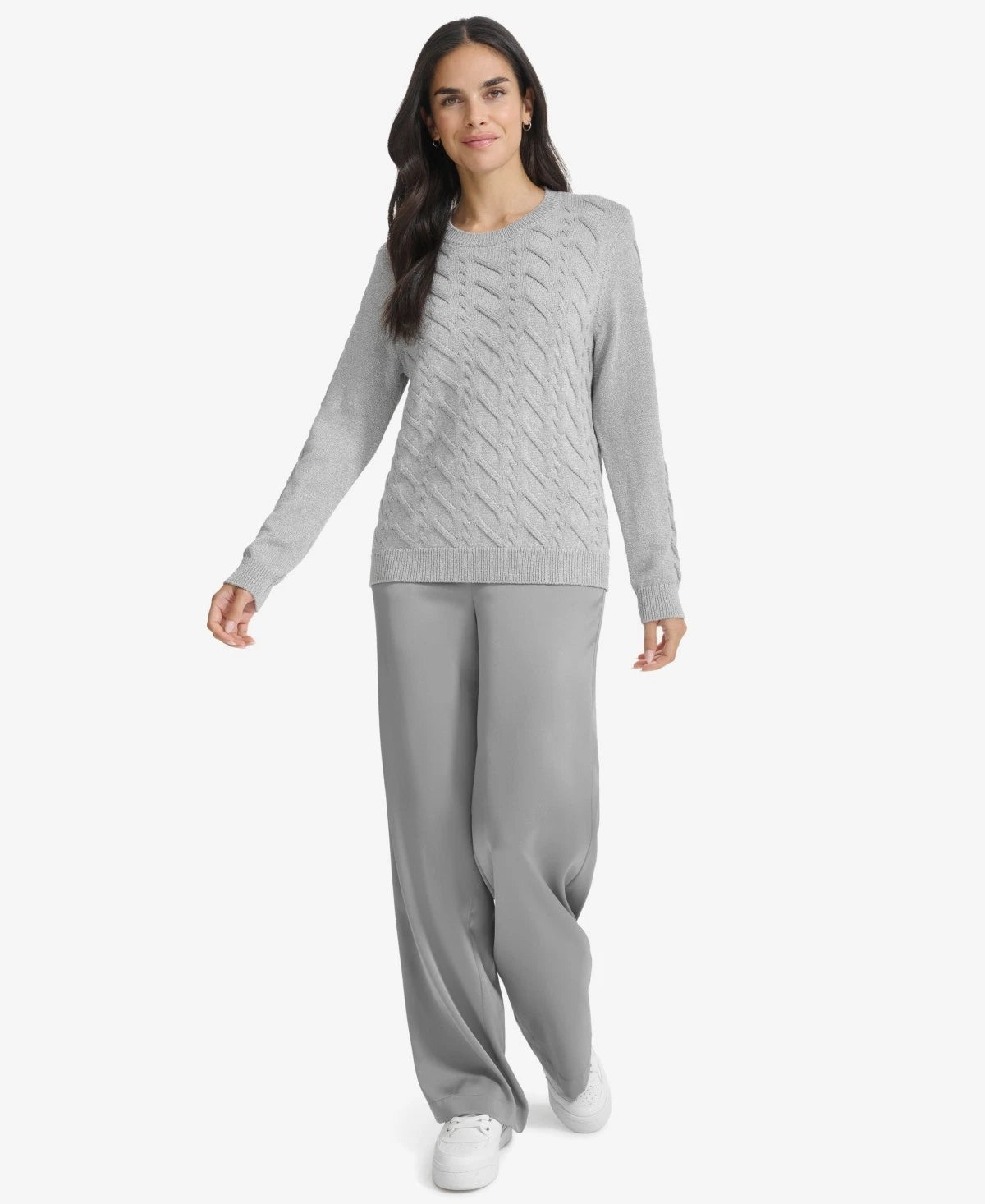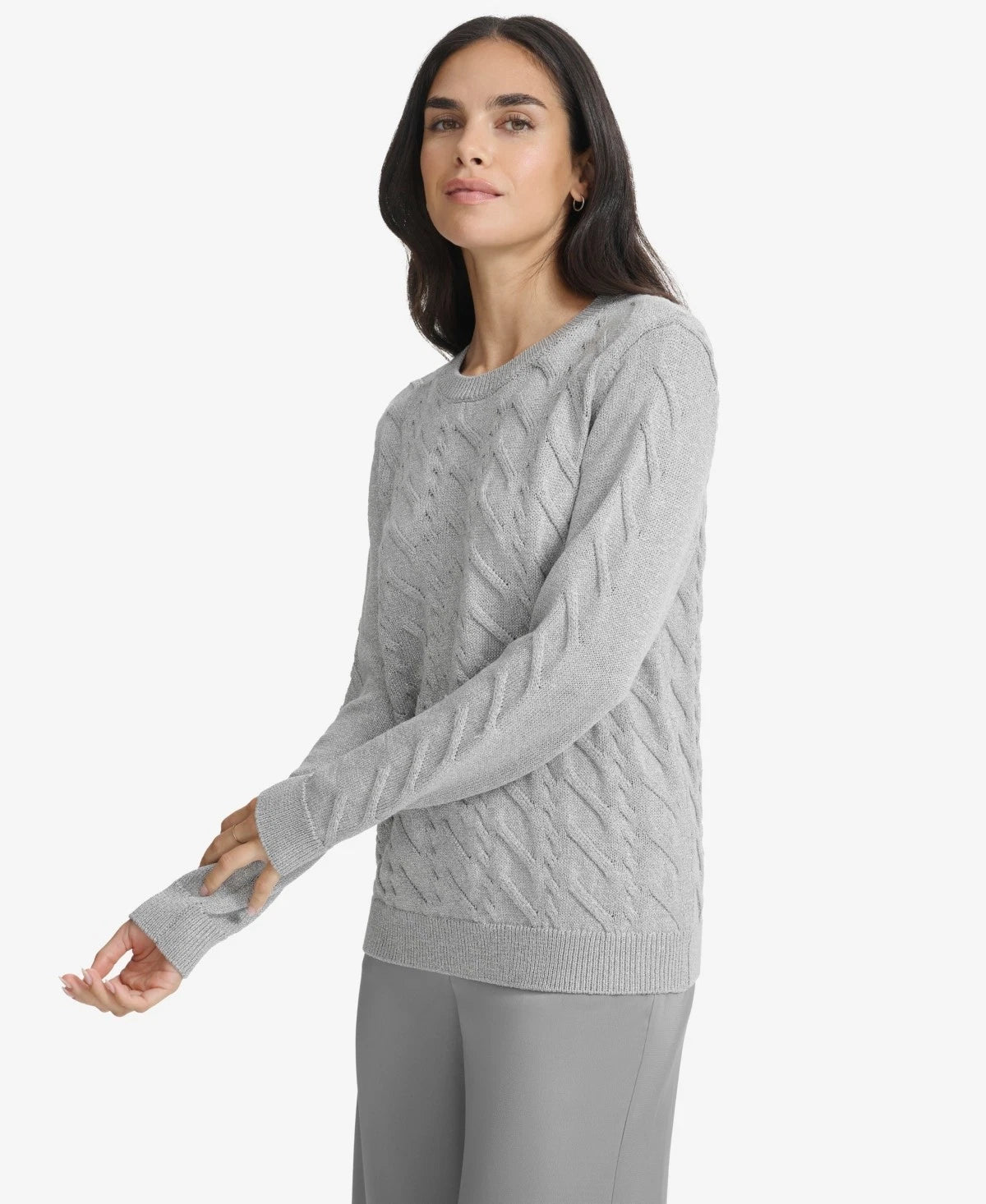 A subtle metallic knit lends a chic finish to this classic cable-knit sweater by Calvin Klein.