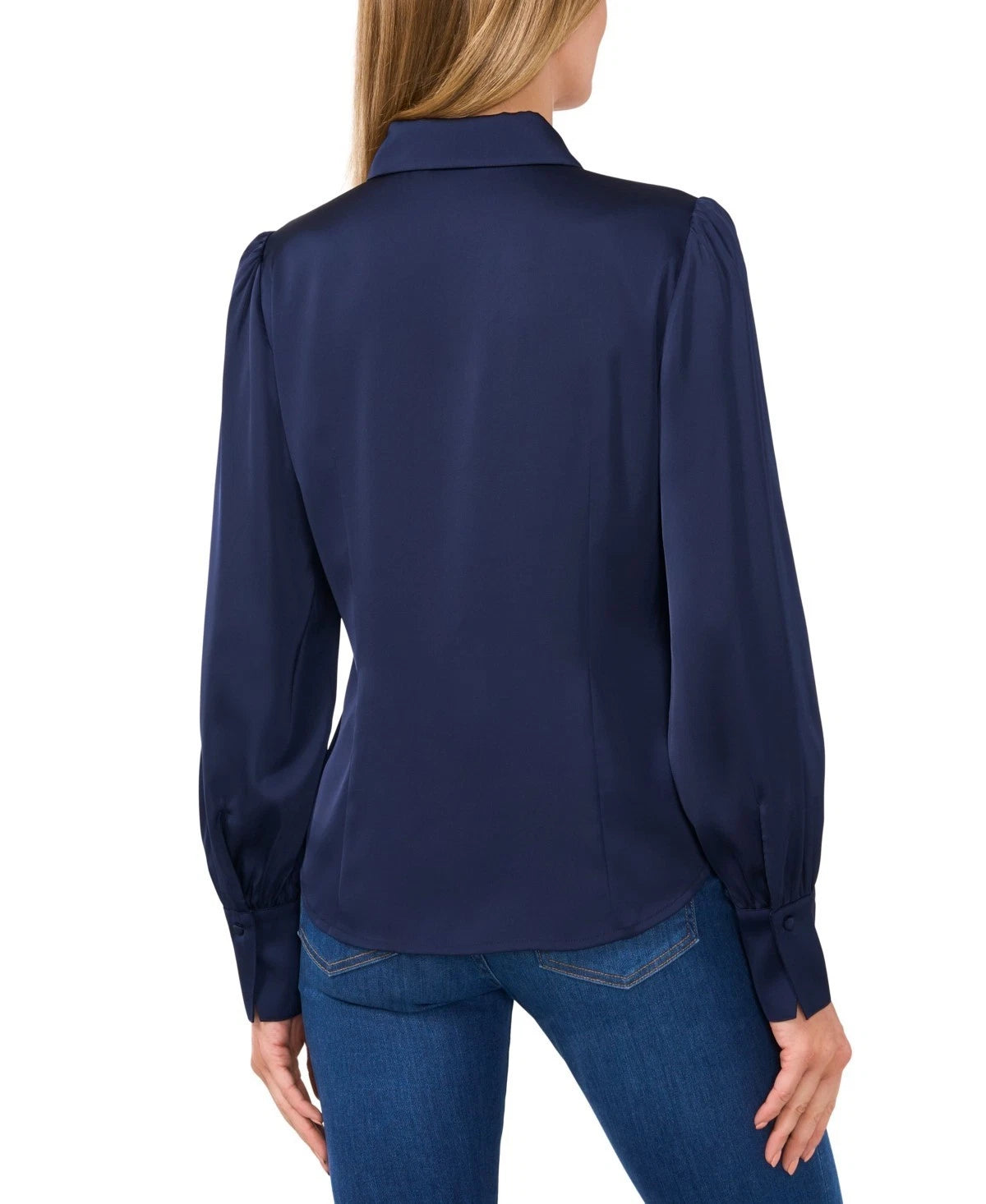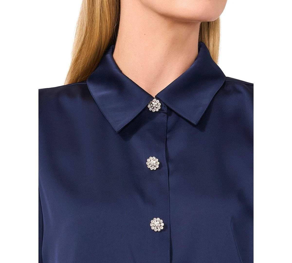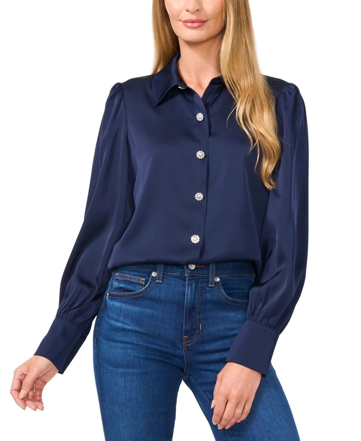 Shine on in a satin blouse from CeCe, upgraded with puff-shoulder sleeves and rhinestone flower-shaped buttons. ABOUT THE BRAND: CeCe is a contemporary lifestyle brand inspired by a romantic take on the everyday, punctuated by taste, wit, and on-the-go flair.