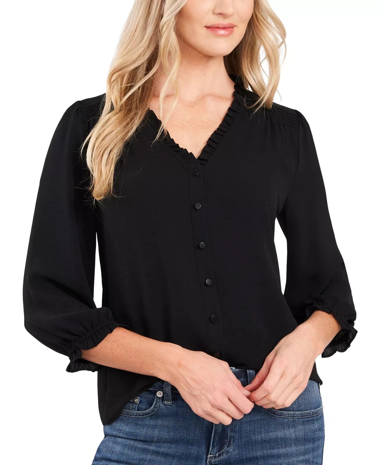 CeCe Women's Ruffled Button-Front 3/4-Sleeve Blouse Black Size S MSRP $69\