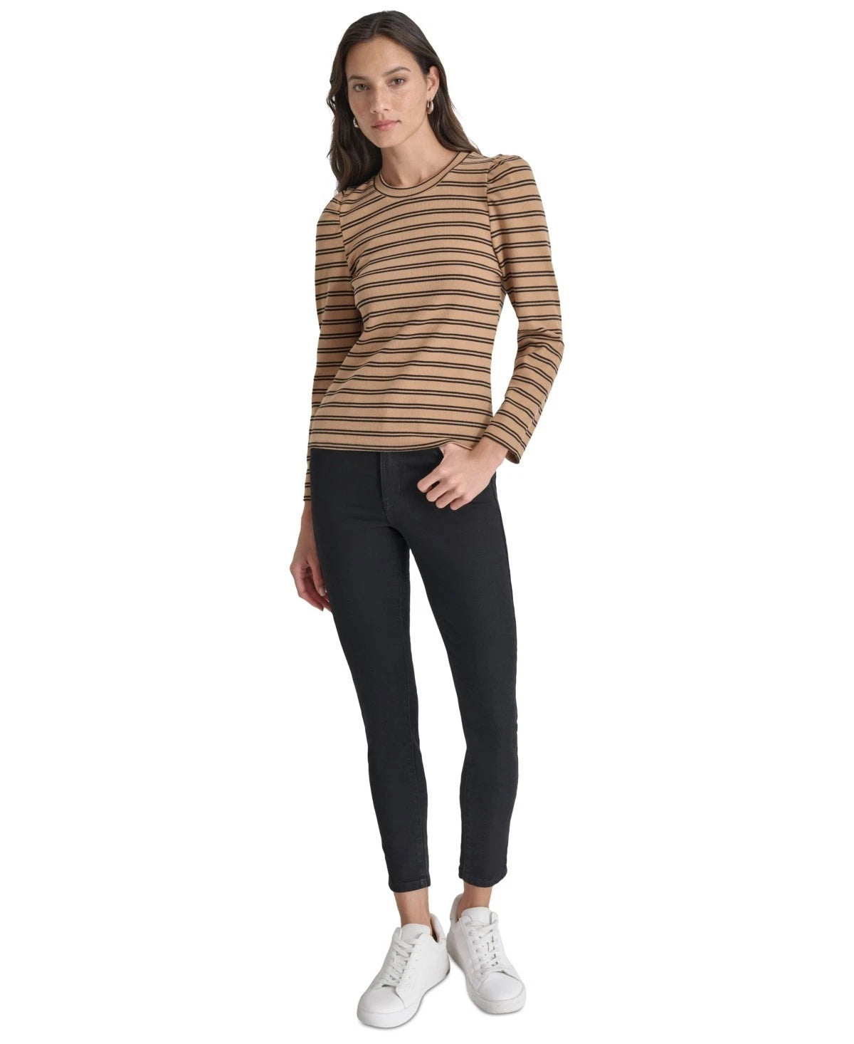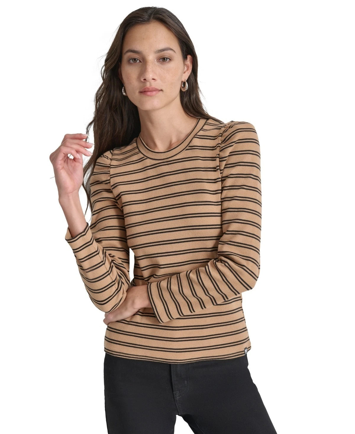 DKNY Jeans Petite Striped Round-Neck Puff-Shoulder Top Size PS Brown