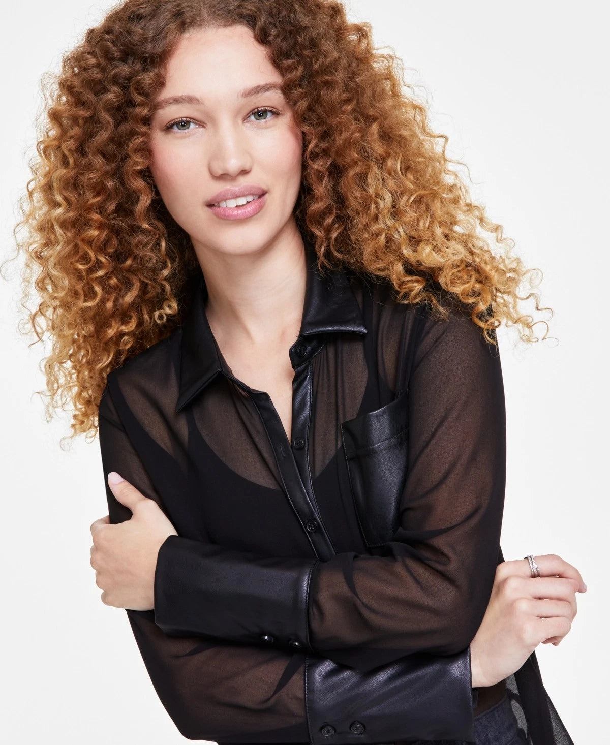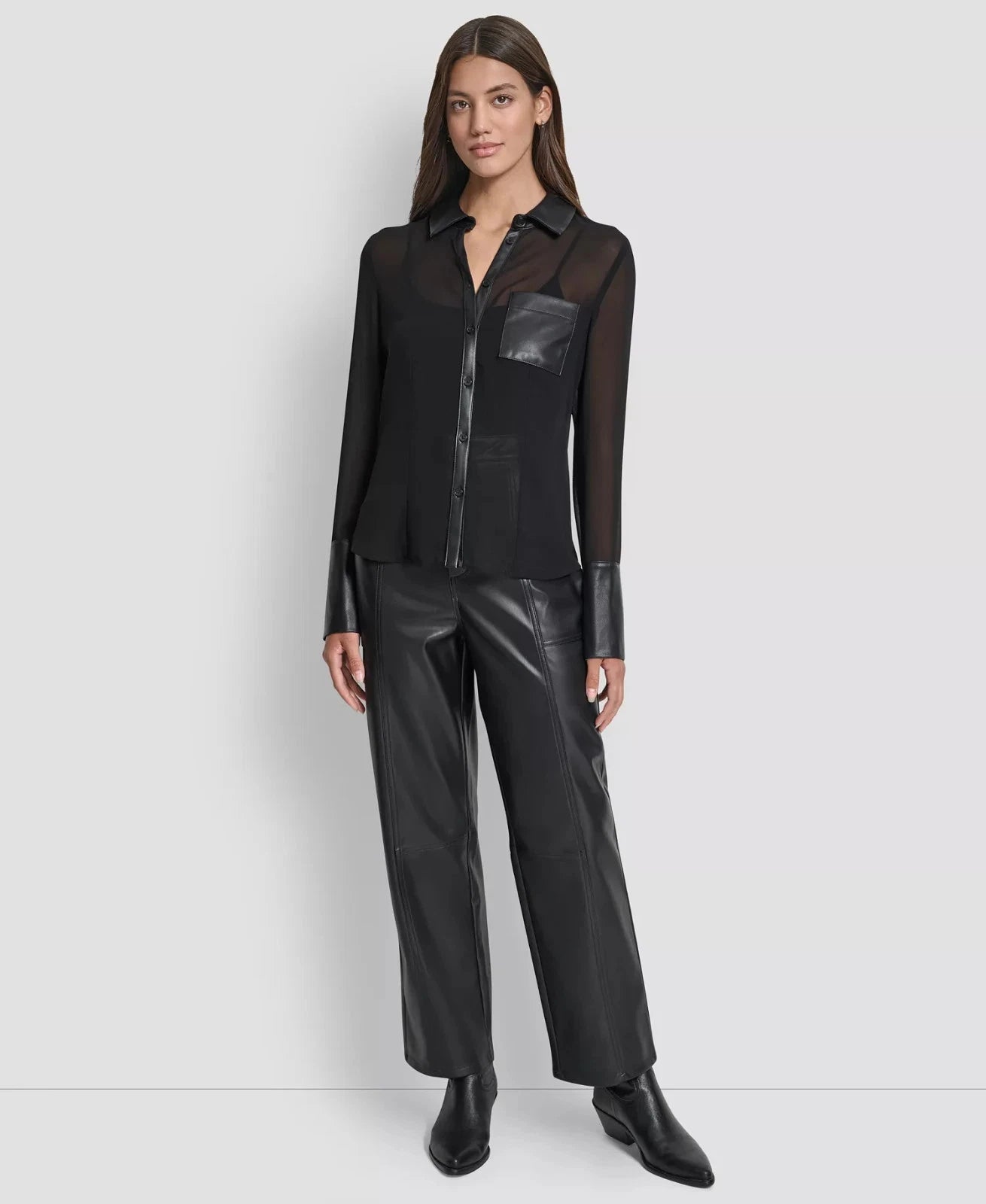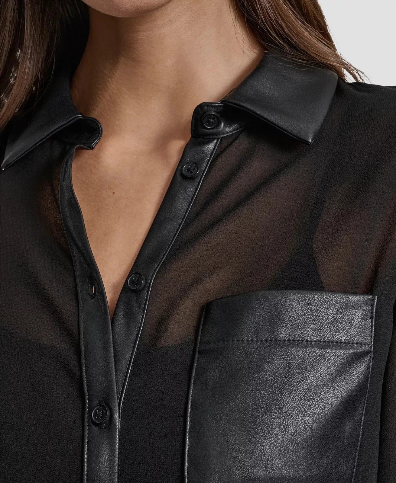 DKNY Jeans Women's Faux-Leather Trim Sheer-Mesh Shirt Black Size L MSRP $79