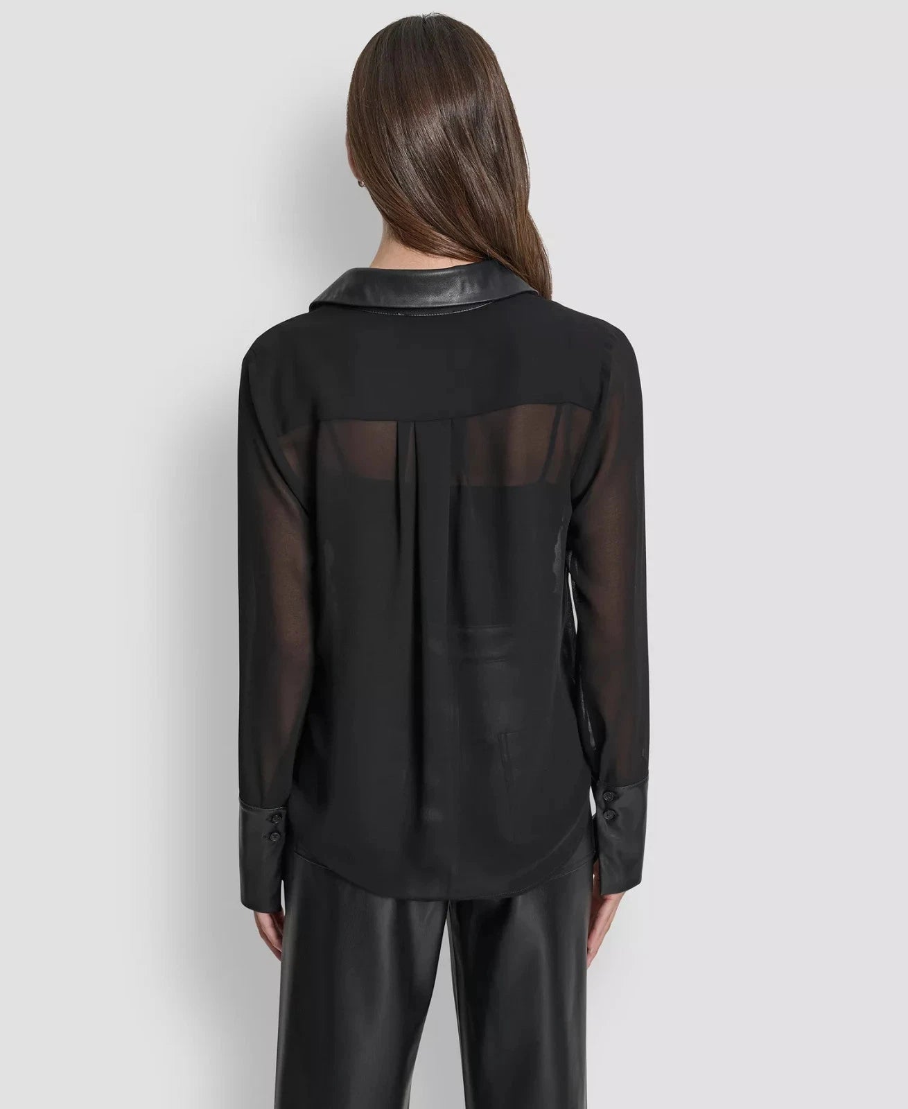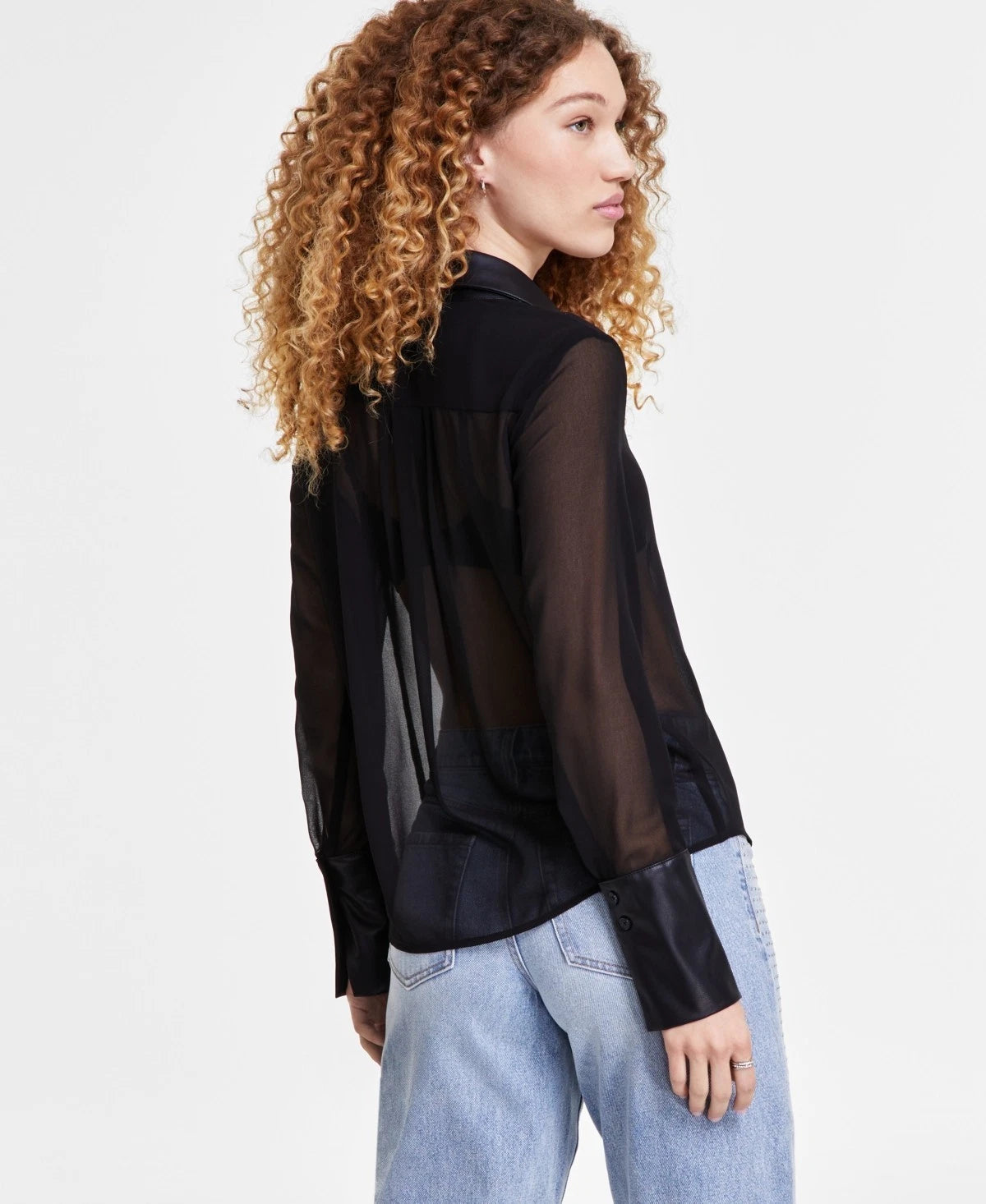 DKNY Jeans Women's Faux-Leather Trim Sheer-Mesh Shirt Black Size S MSRP $79