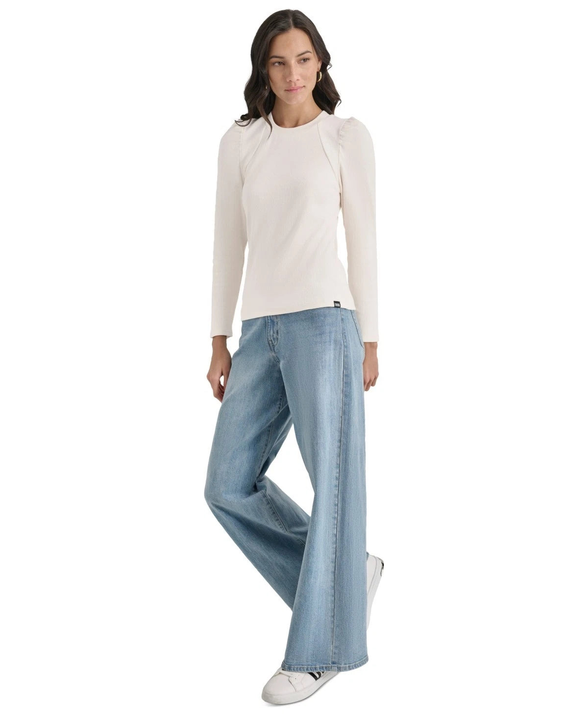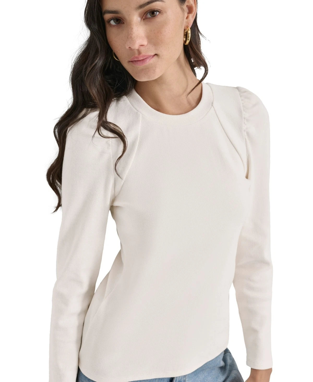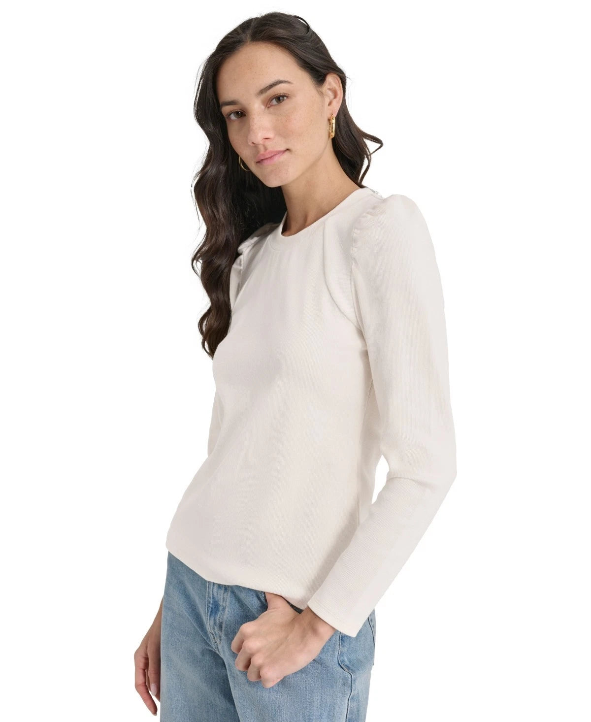 DKNY Jeans Women's Long Puff-Sleeve Crewneck Top Ivory Size XS