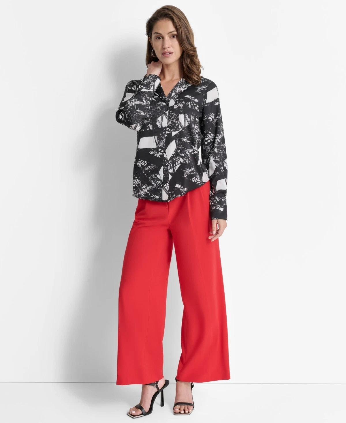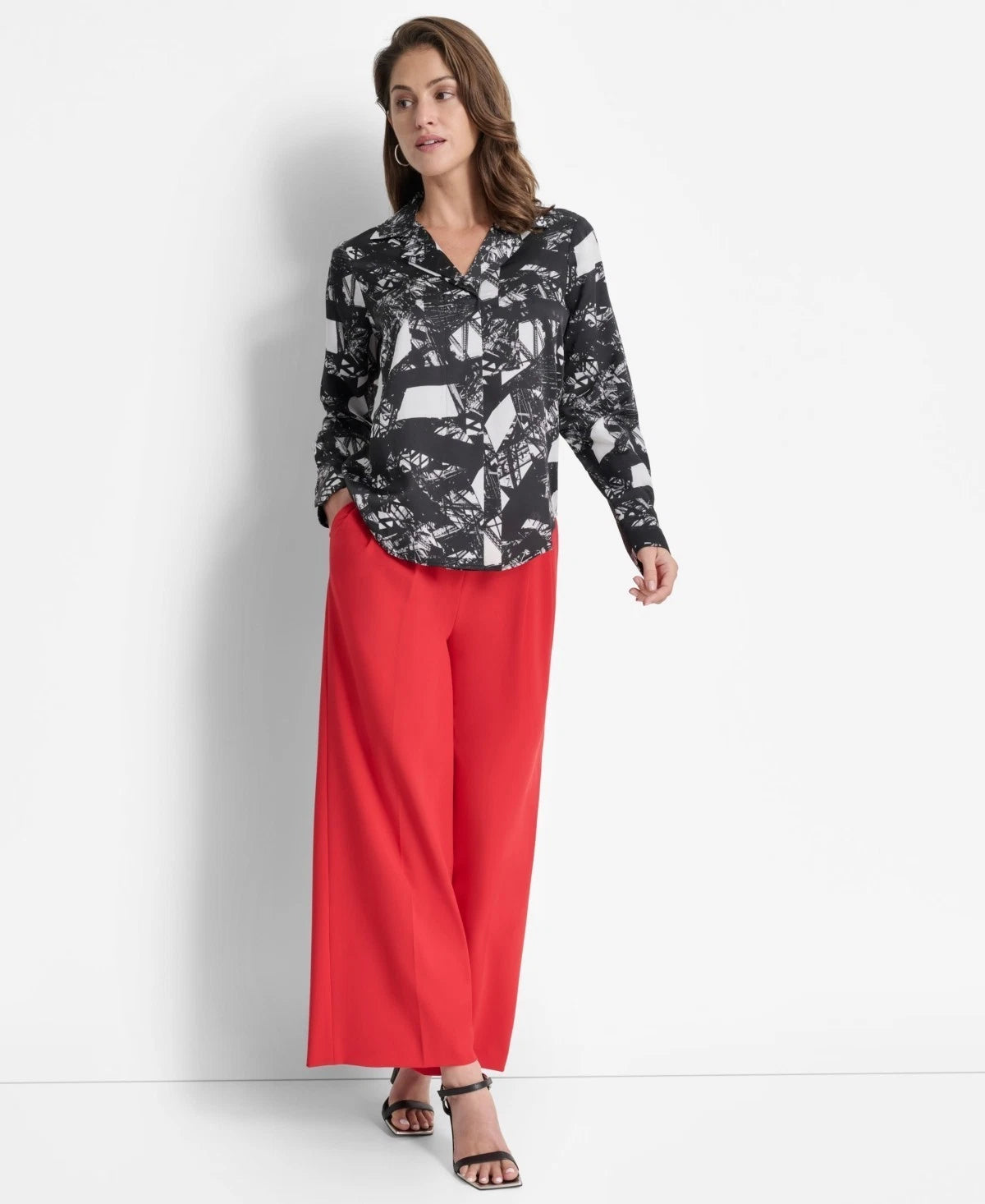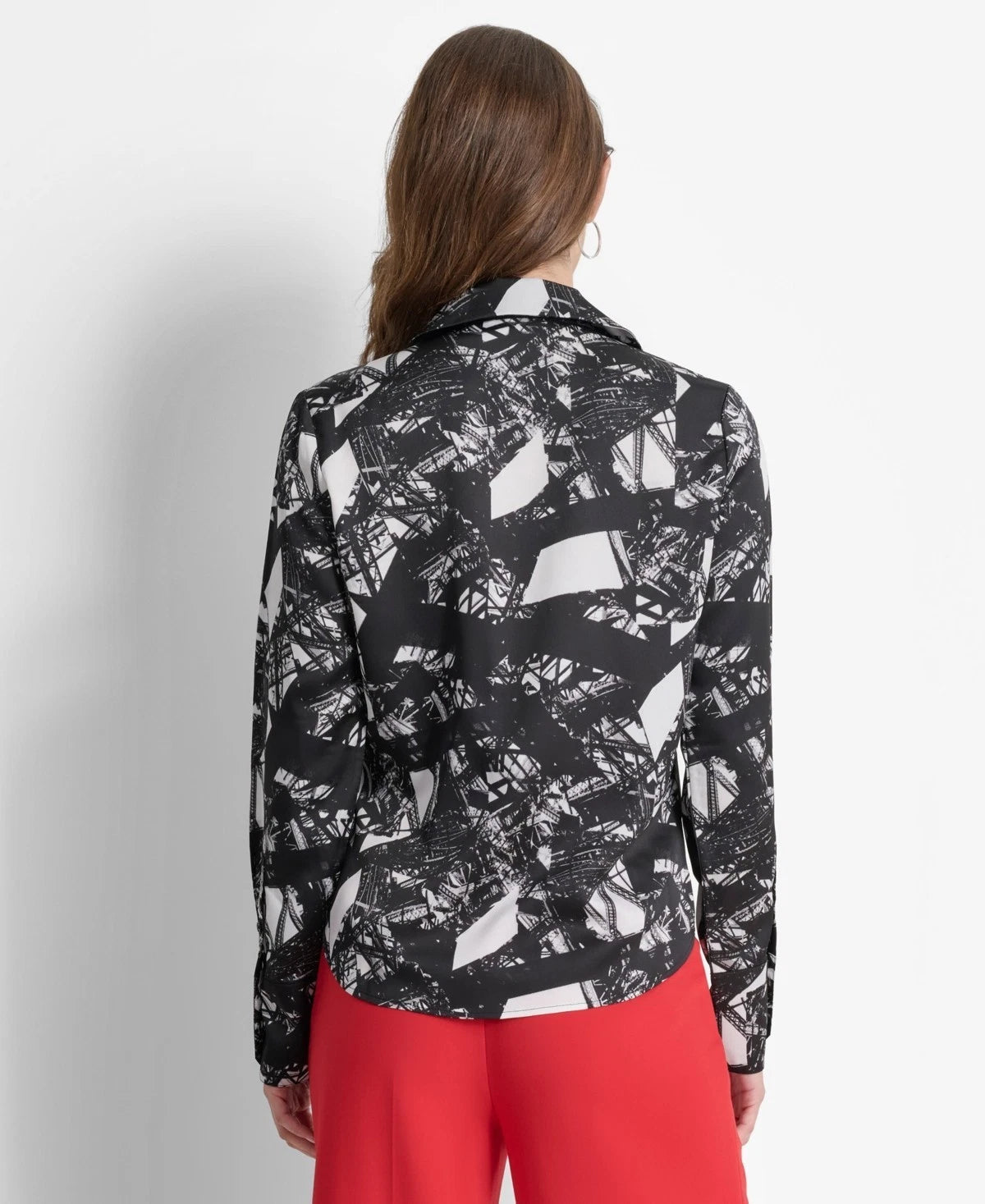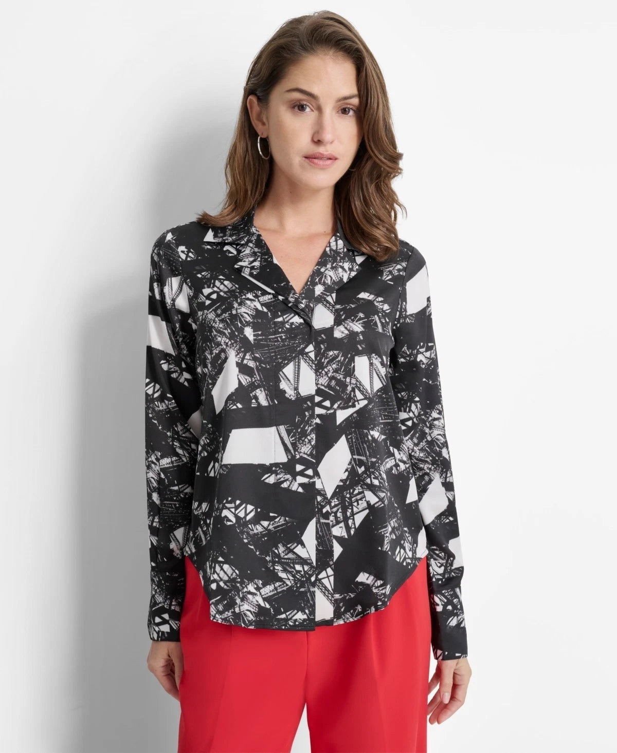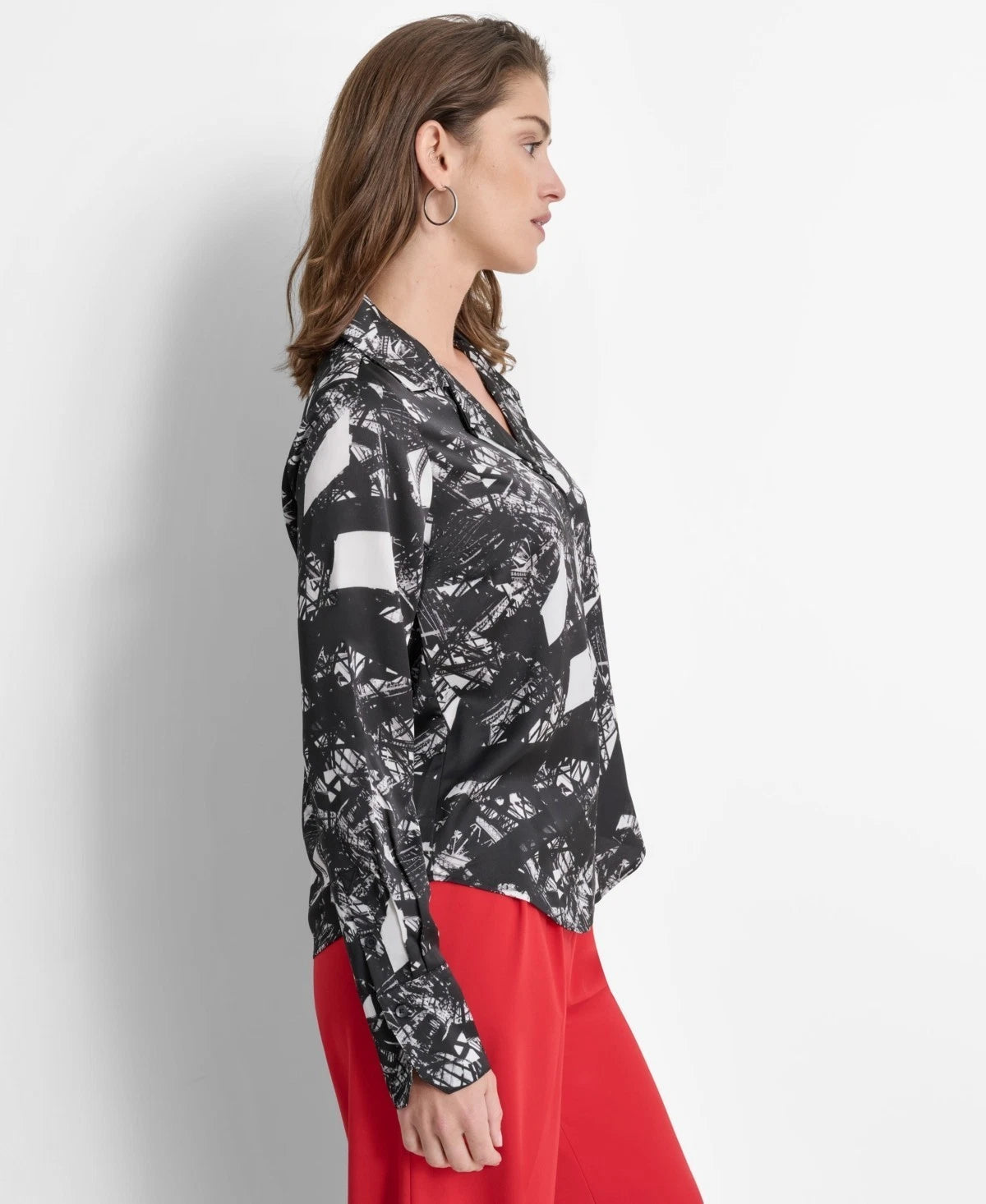 DKNY Women Printed Button-Front Long-Sleeve Satin Blouse Black Size XL MSRP $79
