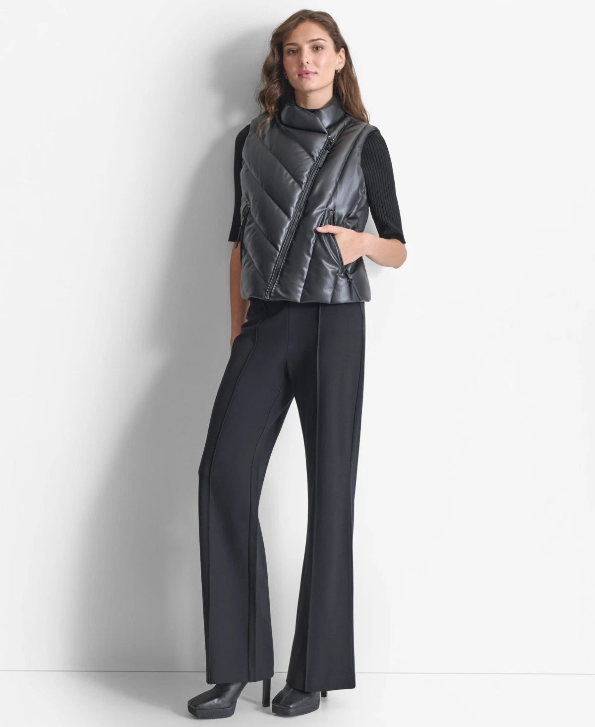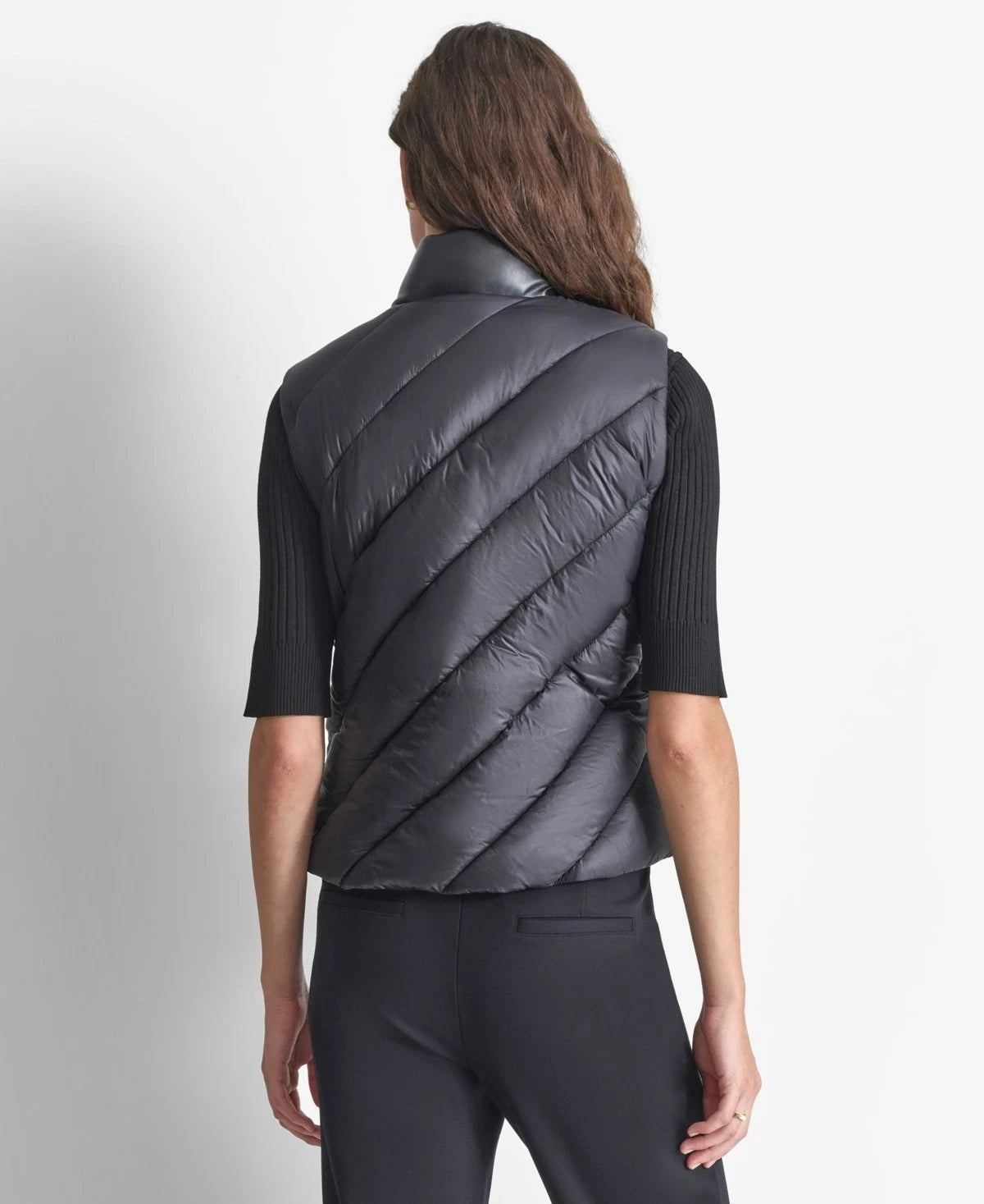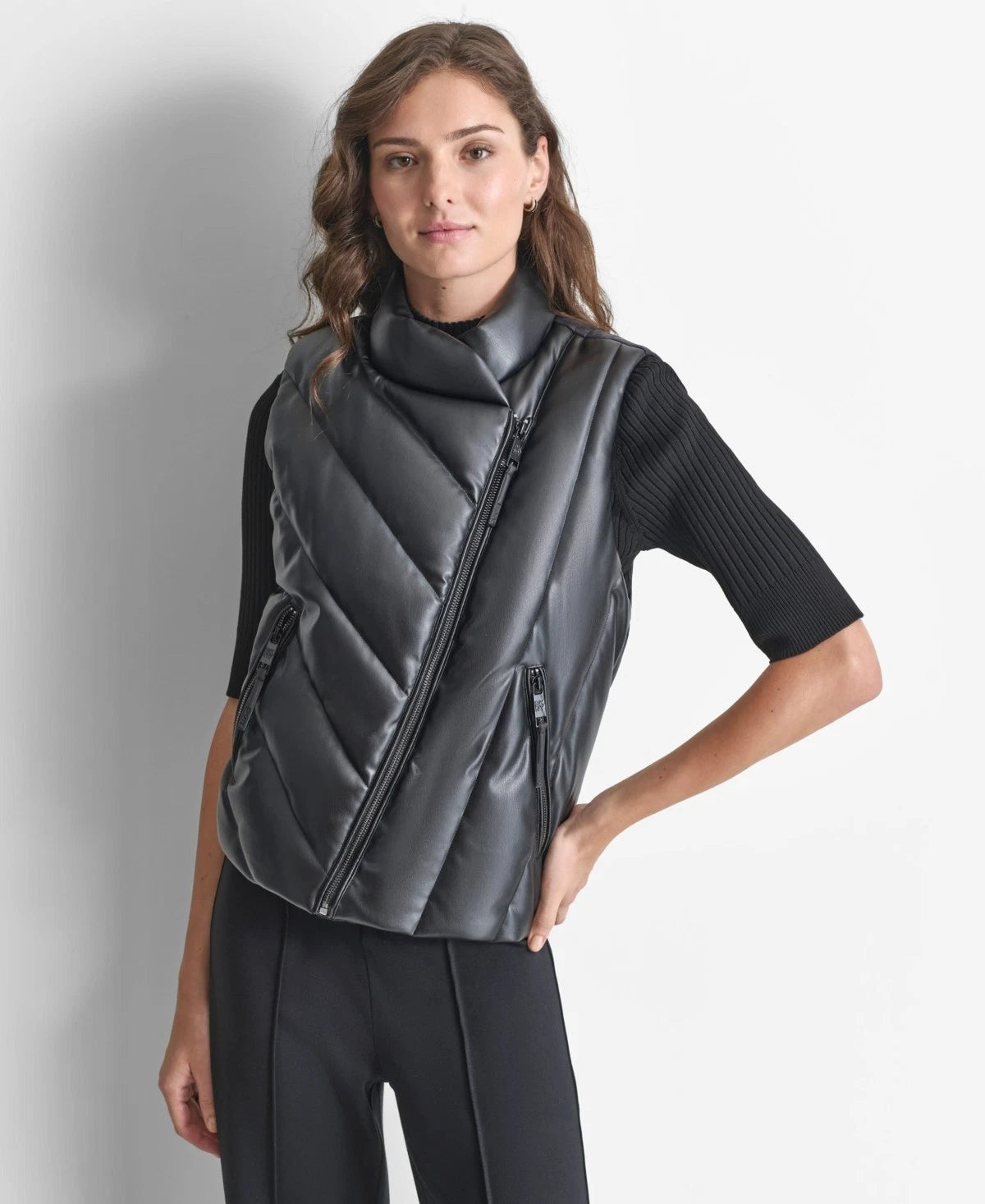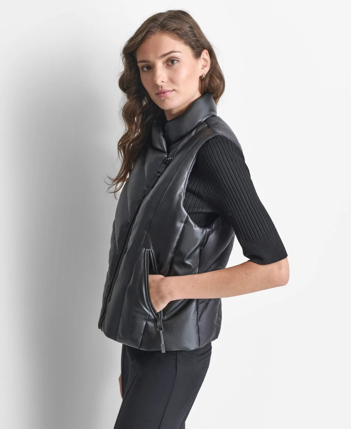 DKNY Women's Faux-Leather Zip-Front Puffer Vest Black Size L MSRP $129